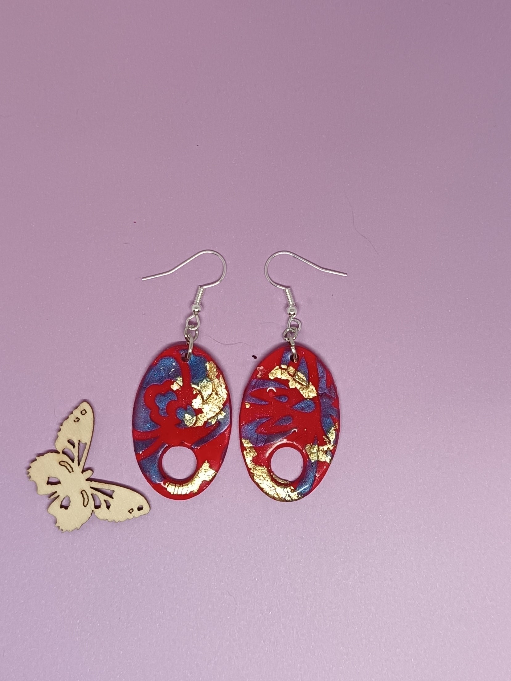 Korvakorut on FIMO Soft polymeerimassaa, joka on päällystetty UV RESINILLÄ. Päällä on lehtikultaa. Koukku on kirurginterästä. Nikkelitön ja allergiatestattu. Tuotteella ilmainen toimitus.