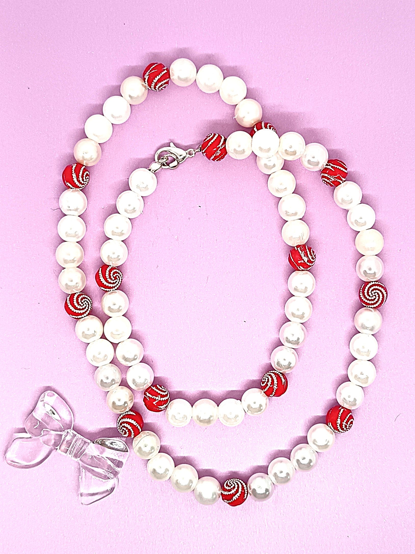 Kaulakoru vaaleista ja punaisista helmistä. Koru on pituudeltaan noin 20cm. Koru tehty elastiseen venyvään kuminauhaan. Tuotteella ilmainen toimitus.