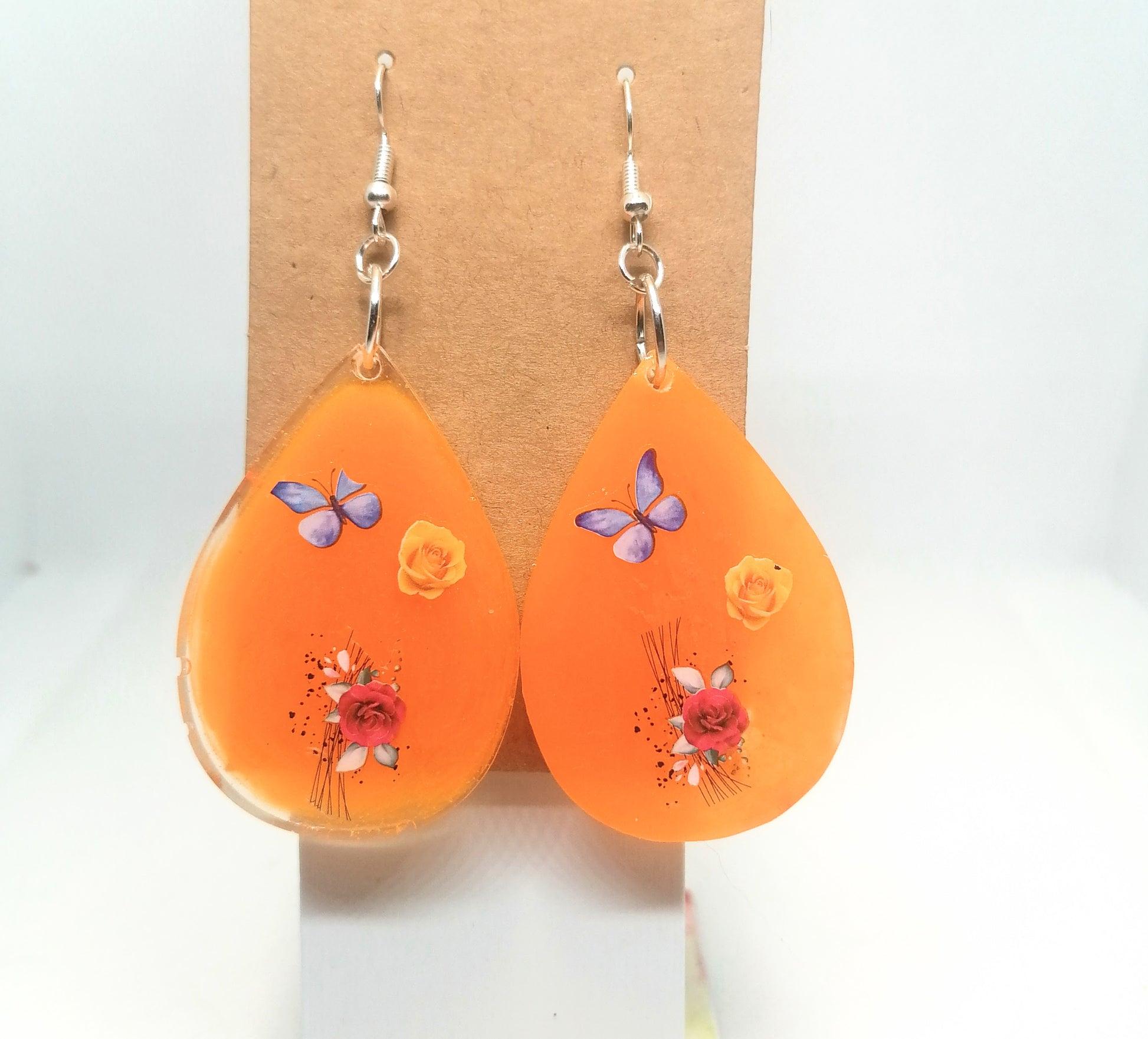 Hopeoitu rauta koukkukorvakoru. Riipus on glorexin kidehartsia, on värjätty oranssin sävyyn. Etupuolella on tarroja. Tuotteella ilmainen toimitus.