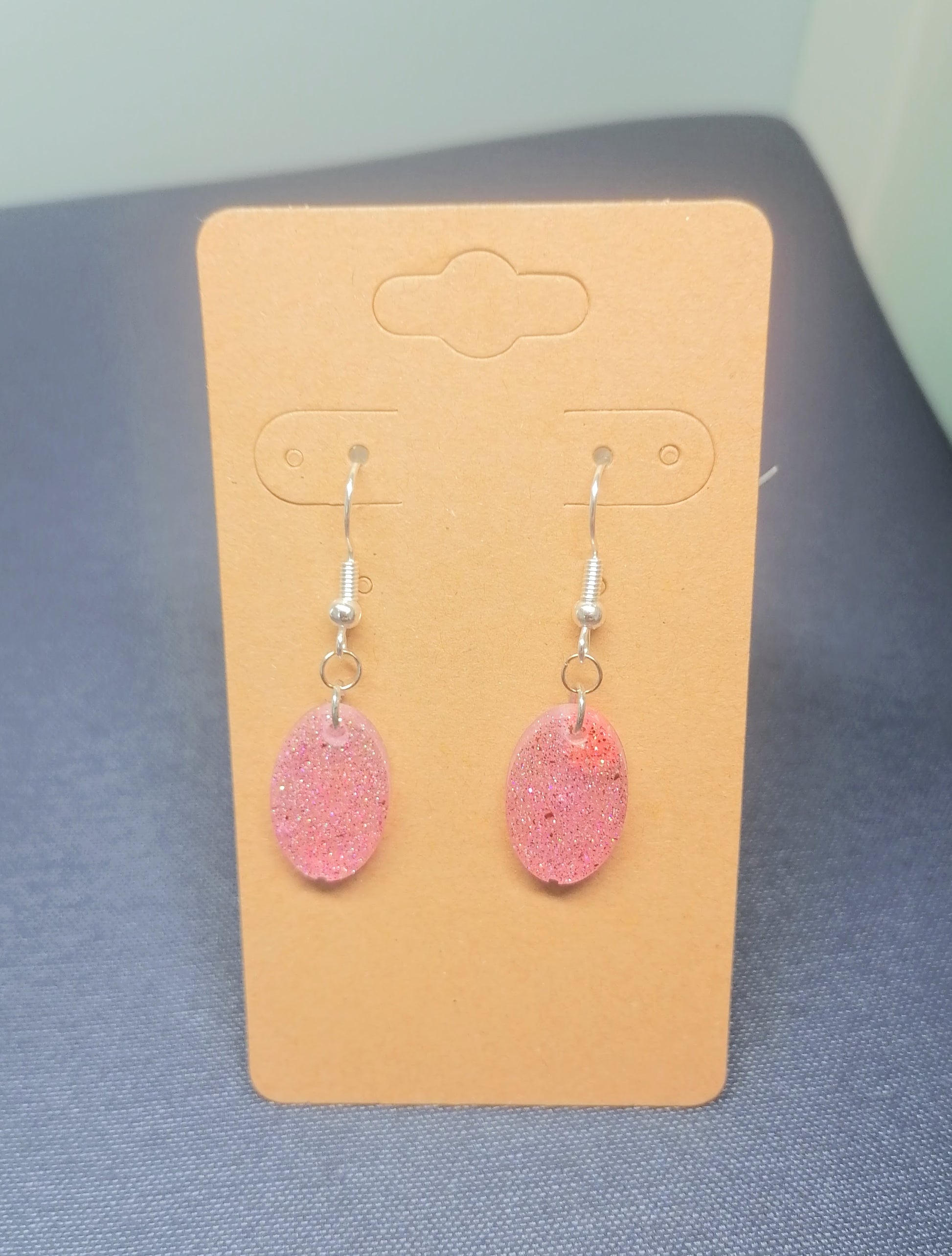 Hopeoitu rauta koukkukorvakoru. Riipus on glorexin kidehartsia, on värjätty vaaleanpunaisen sävyyn. Seassa on glitteriä. Tuotteella ilmainen toimitus.