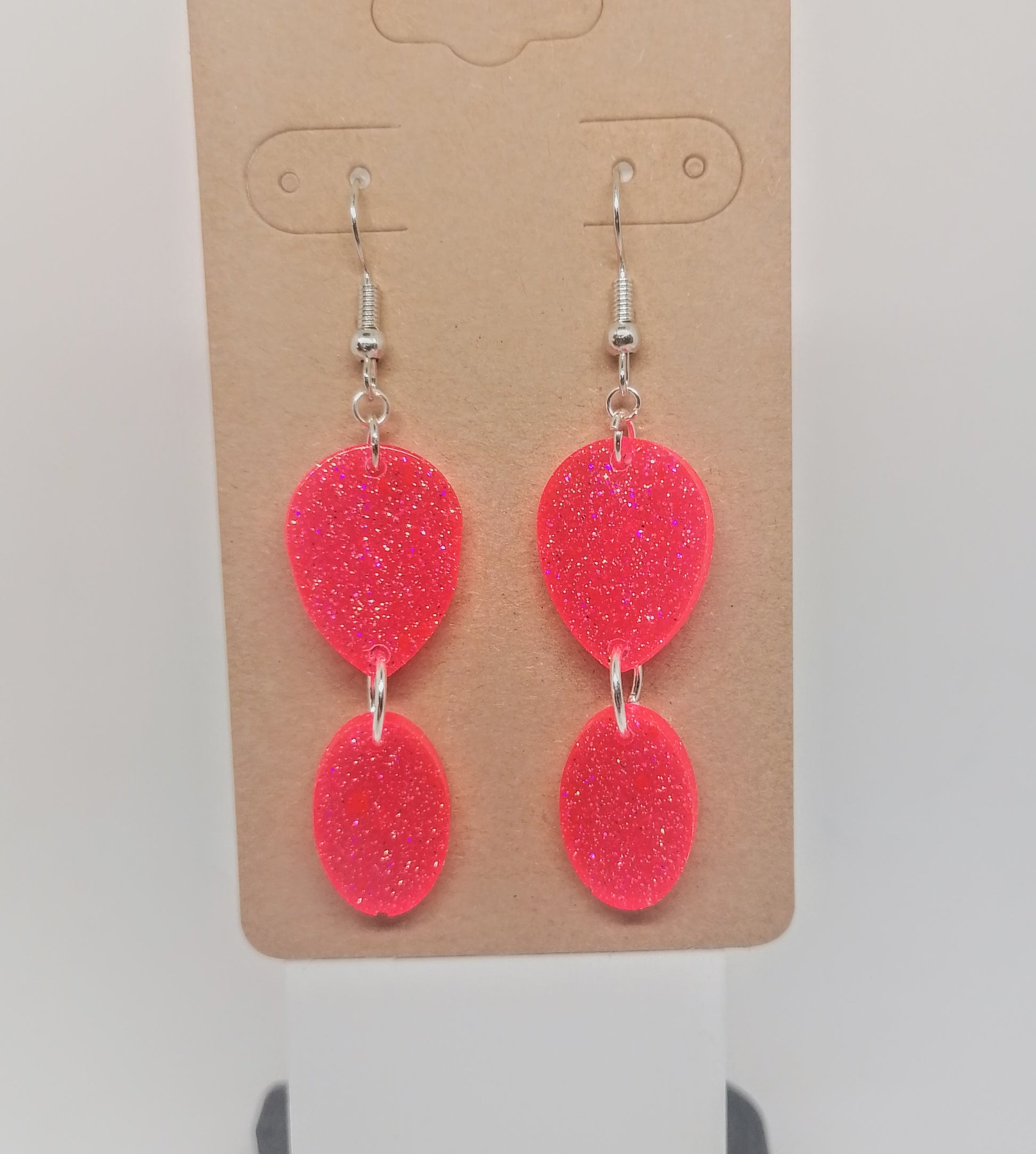Hopeanvärinen  rauta koukkukorvakoru. Riipus on glorexin kidehartsia, joka on värjätty pinkin sävyyn. Seassa myös glitteriä ja hilettä. Tuotteella ilmainen toimitus. Kuva vääristää väriä.