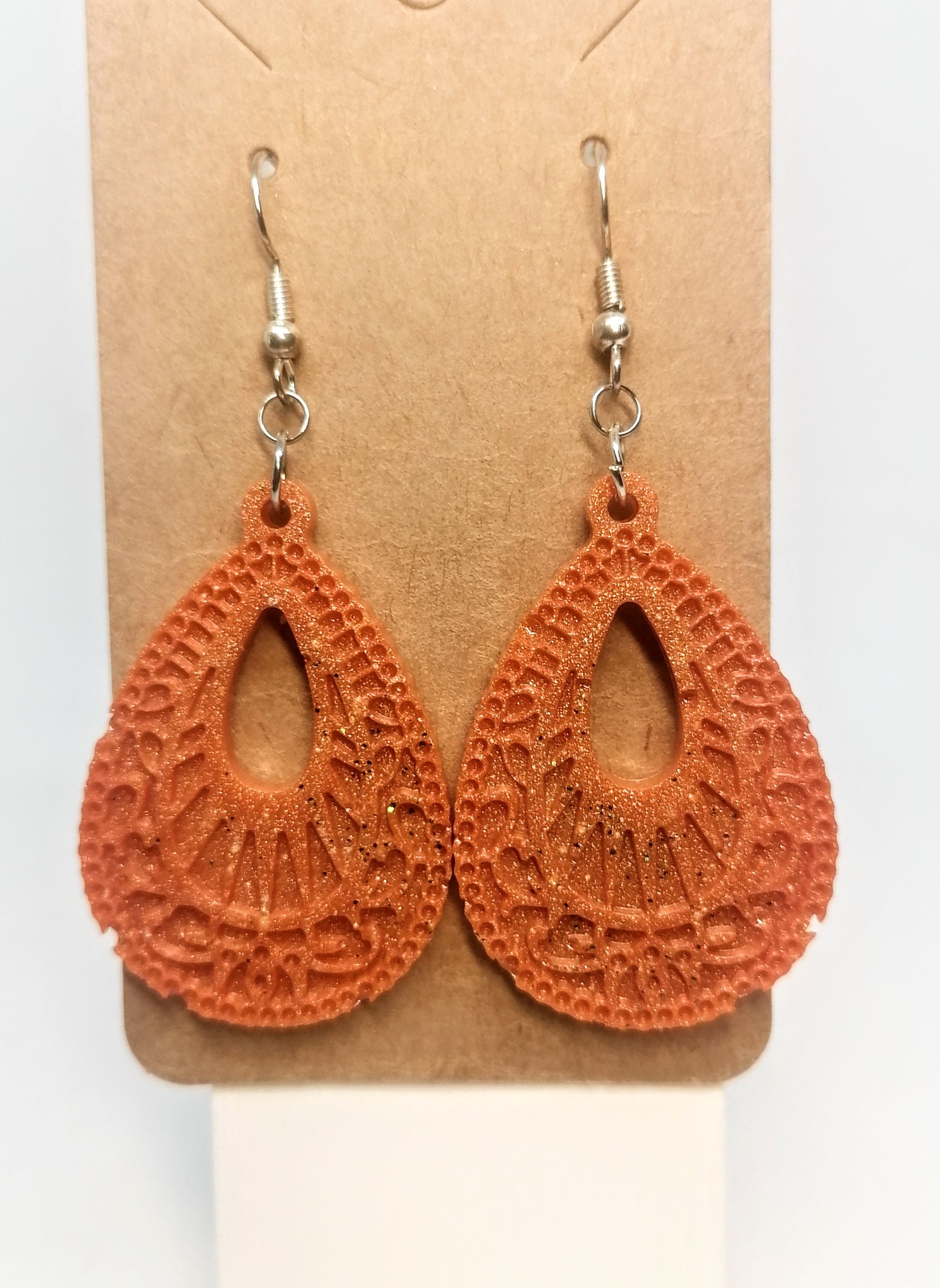 Hopeanvärinen rauta koukkukorvakoru. Riipus on glorexin kidehartsia. Riipus on värjätty oranssin sävyyn, etupuolella on kuviointia. Seassa on glitteriä. Tuotteella ilmainen toimitus.