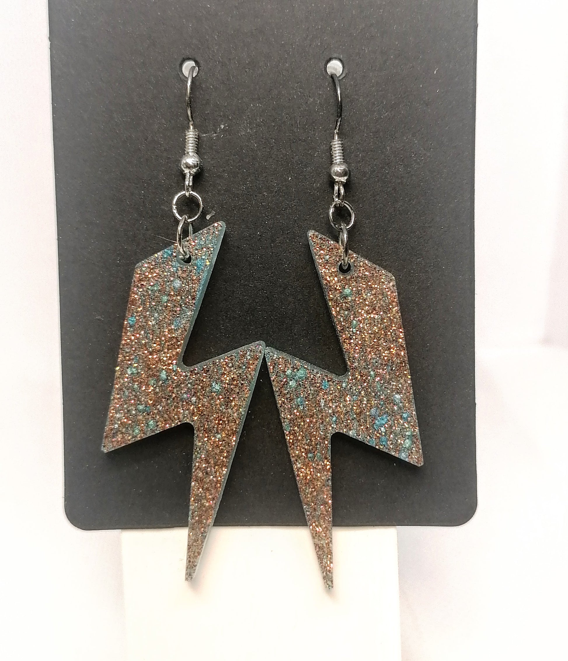 Hopeanvärinen rauta koukkukorvakoru. Riipus on glorexin kidehartsia. Riipus on värjätty turkoosin väriseksi. Seassa on glitteriä punaisen ja ruskean sävyissä. Tuotteella ilmainen toimitus.