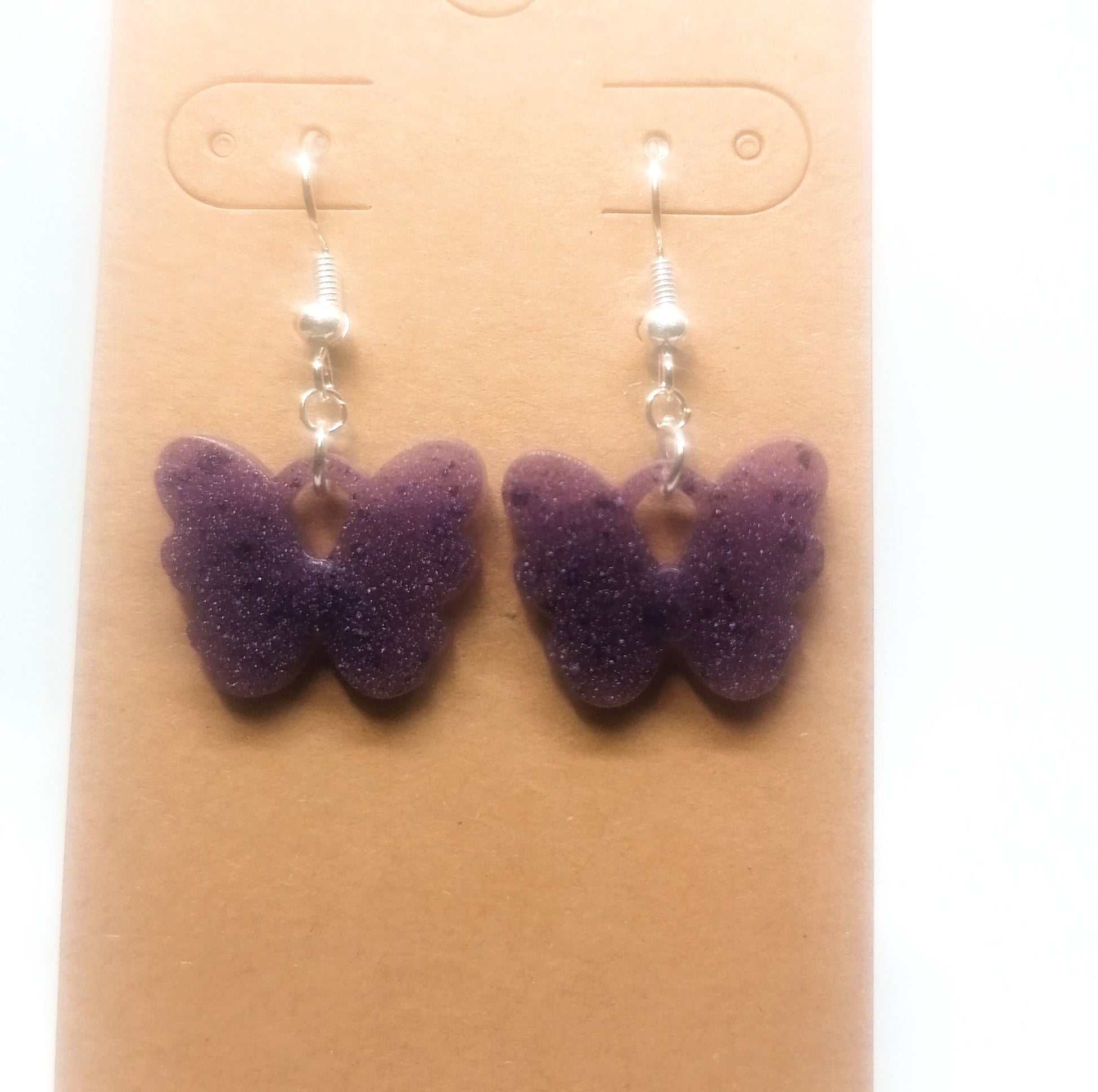 Hopeanvärinen rauta koukkukorvakoru. Riipus on glorexin kidehartsia. Riipus on värjätty violetin sävyyn. Seassa on glitteriä. Tuotteella ilmainen toimitus.