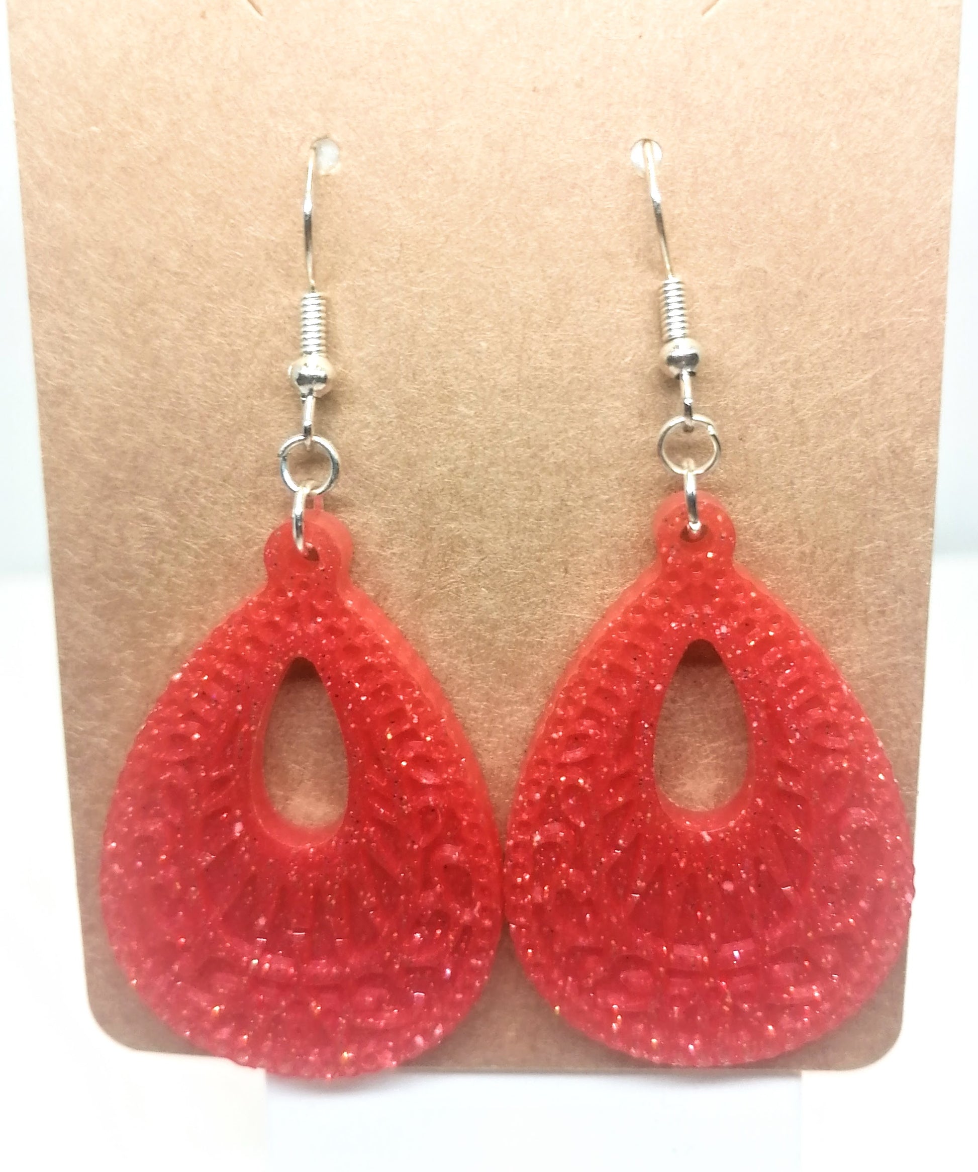 Hopeanvärinen rauta koukkukorvakoru. Riipus on glorexin kidehartsia. Riipus on värjätty punaiseksi. Seassa myös glitteriä. Tuotteella ilmainen toimitus.
