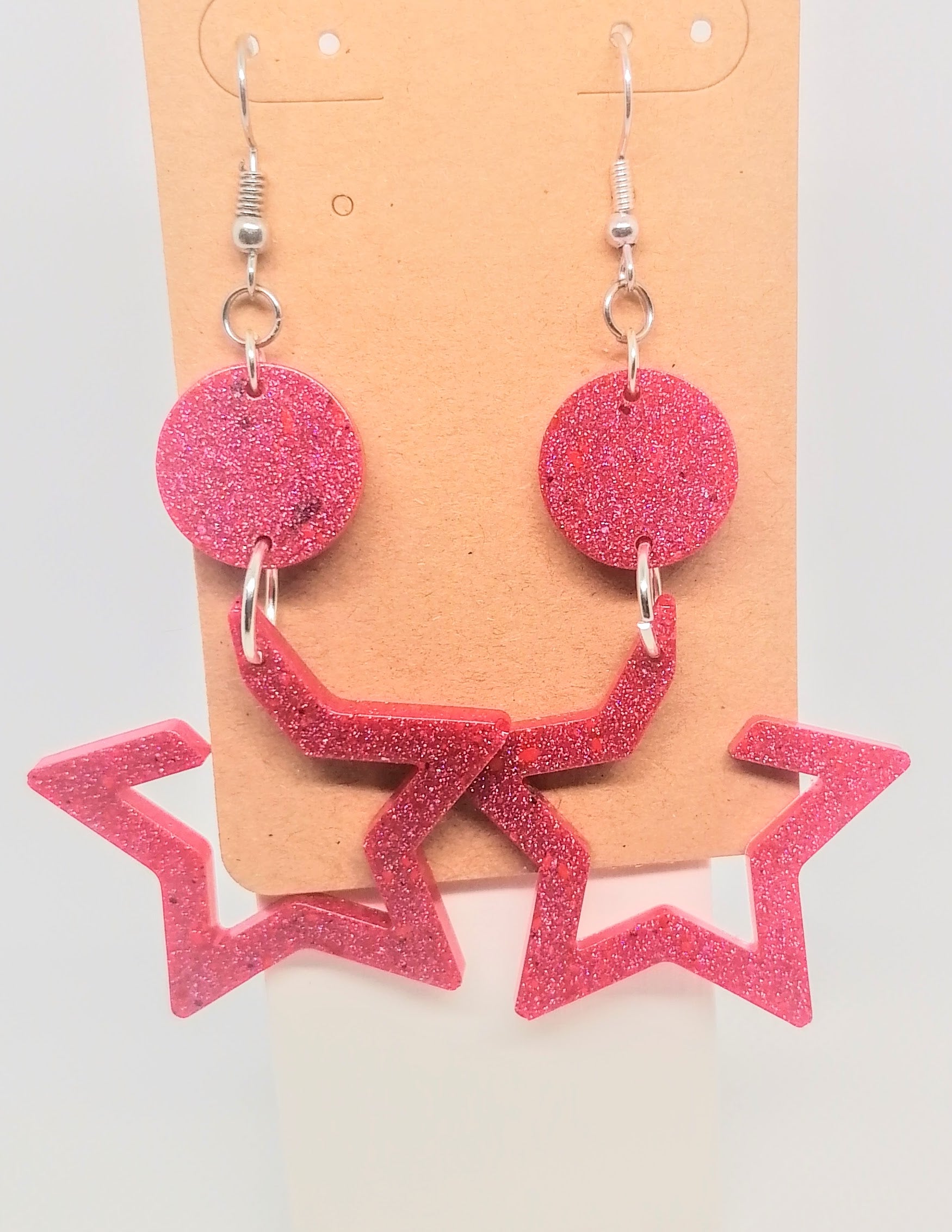 Hopeoitu rauta koukkukorvakoru. Riipus osa on glorexin kidehartsia. Kidehartsi on värjätty lilanpunaiseen sävyyn. Seassa myös glitteriä eriväreissä. Tuotteella ilmainen toimitus