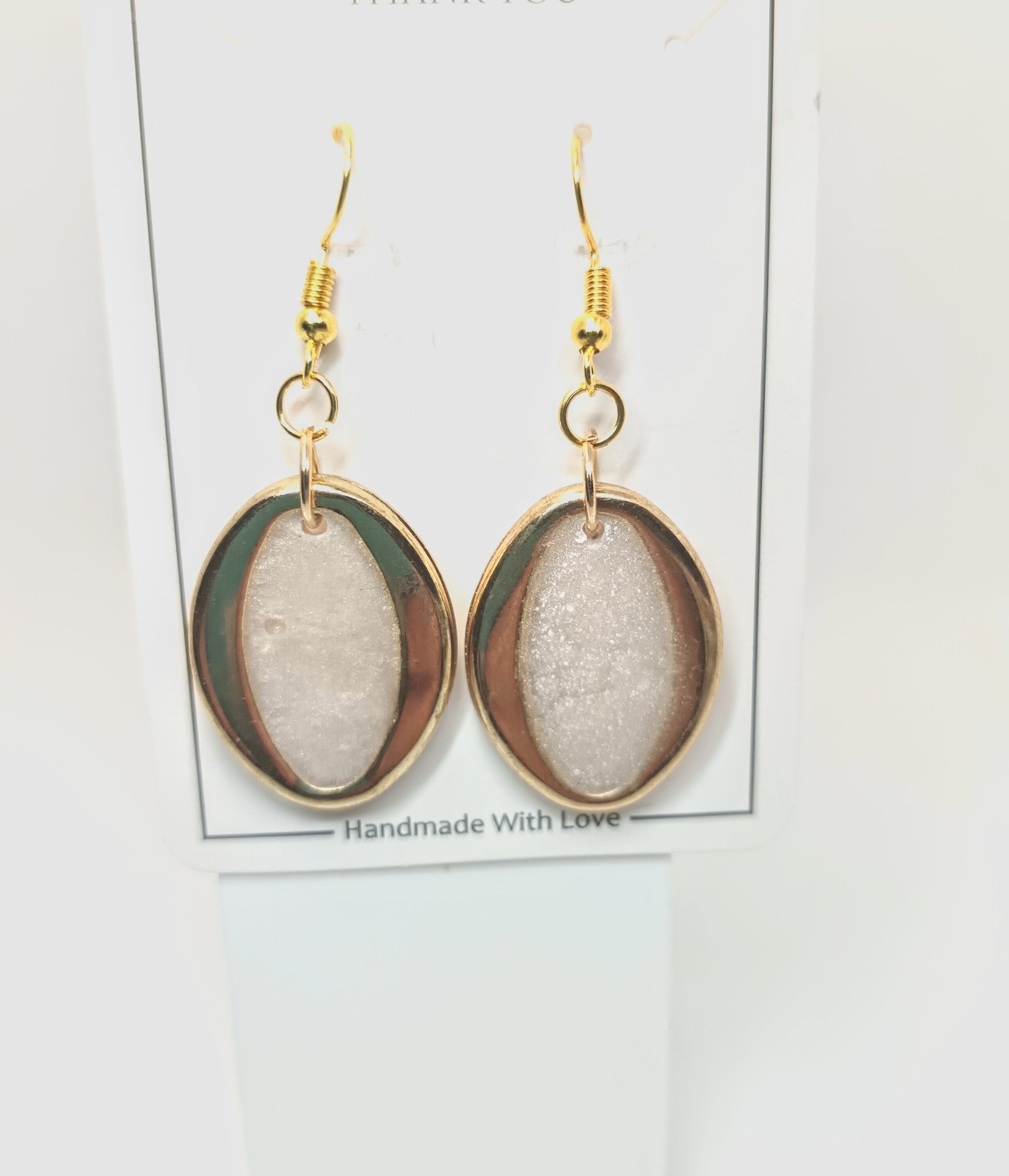 Kullanvärinen rauta koukkukorvakoru. Riipus on glorexin kidehartsia. Koru on tehty kullanväriseen korupohjaan. Riipus on värjätty valkoiseksi.Tuotteella ilmainen toimitus.