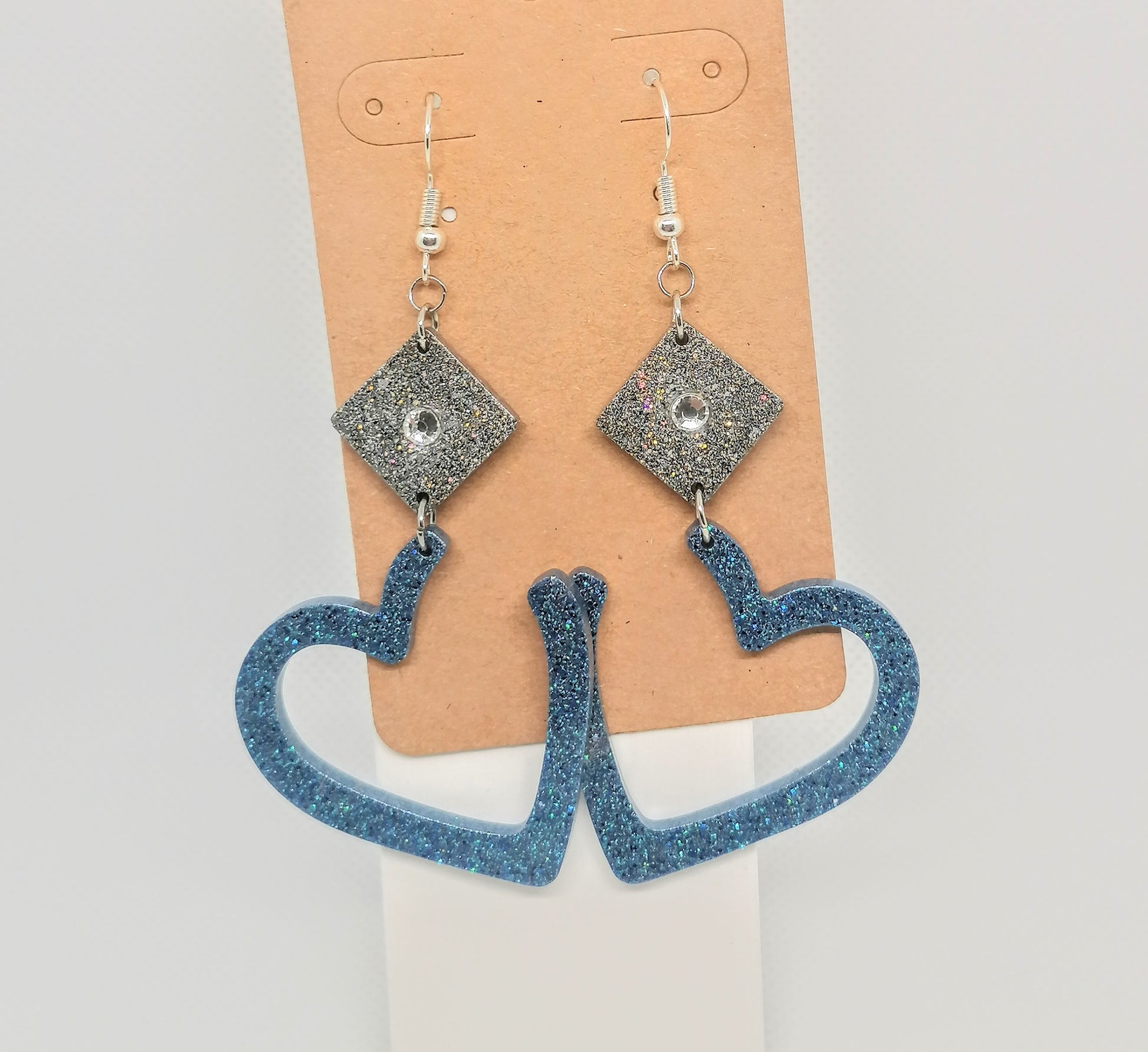 Hopeoitu rauta koukkukorvakoru. Riipus osa on glorexin kidehartsia. Kidehartsin yläosa on harmaa ja alaosa sininen. Seassa myös glitteriä eriväreissä. Tuotteella ilmainen toimitus