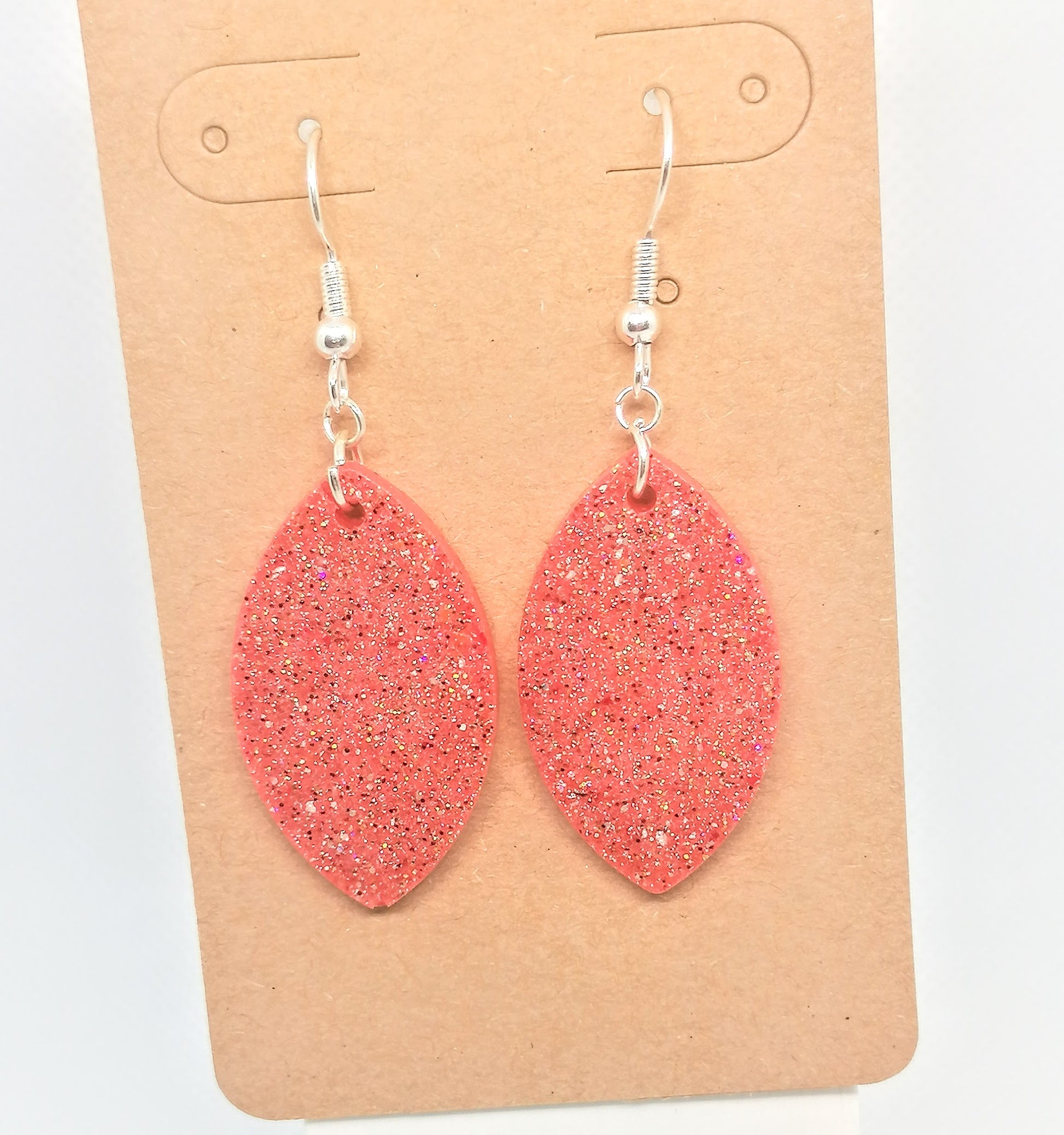 Hopeoitu rauta koukkukorvakoru. Riipus osa on glorexin kidehartsia. Kidehartsi on värjätty punaornssiksi. Seassa myös glitteriä eriväreissä. Tuotteella ilmainen toimitus