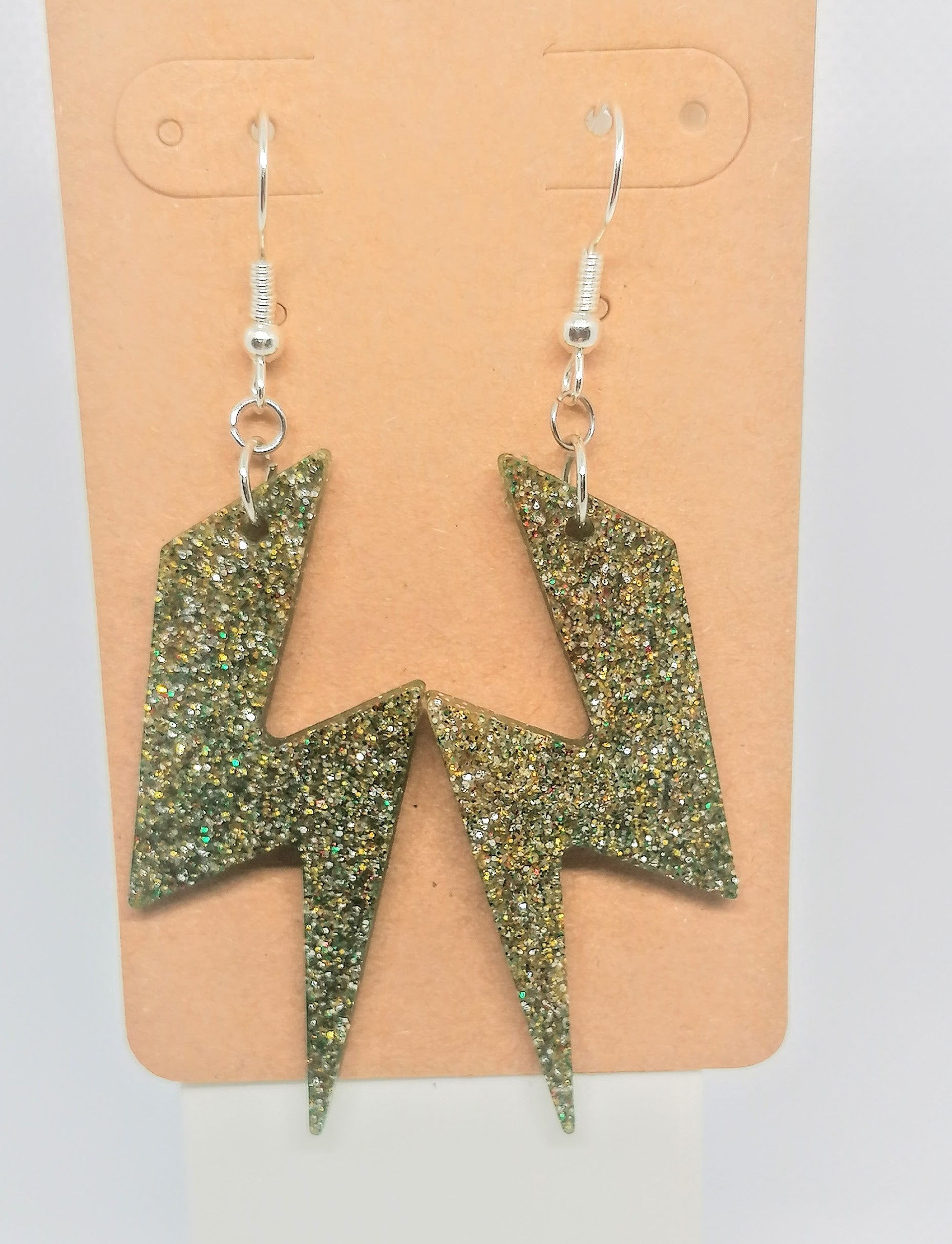 Hopeoitu rauta koukkukorvakoru. Riipus osa on glorexin kidehartsia. Kidehartsi on värjätty vihreän/mustan sekoitukseen . Seassa myös glitteriä eriväreissä. Tuotteella ilmainen toimitus
