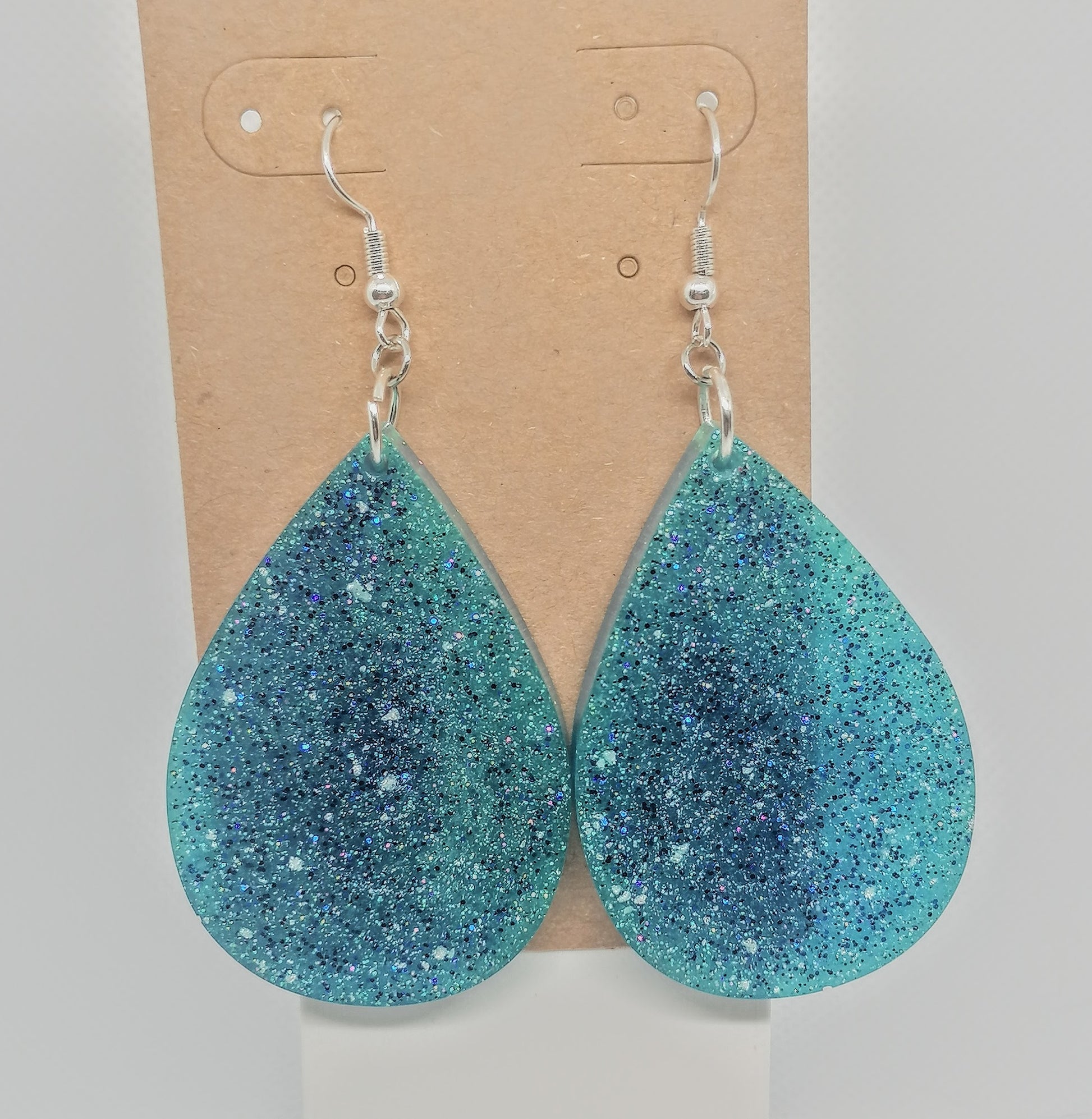 Hopeoitu rauta koukkukorvakoru. Riipus osa on glorexin kidehartsia. Kidehartsi on värjätty turkoosiin sävyyn. Seassa myös glitteriä eriväreissä. Tuotteella ilmainen toimitus