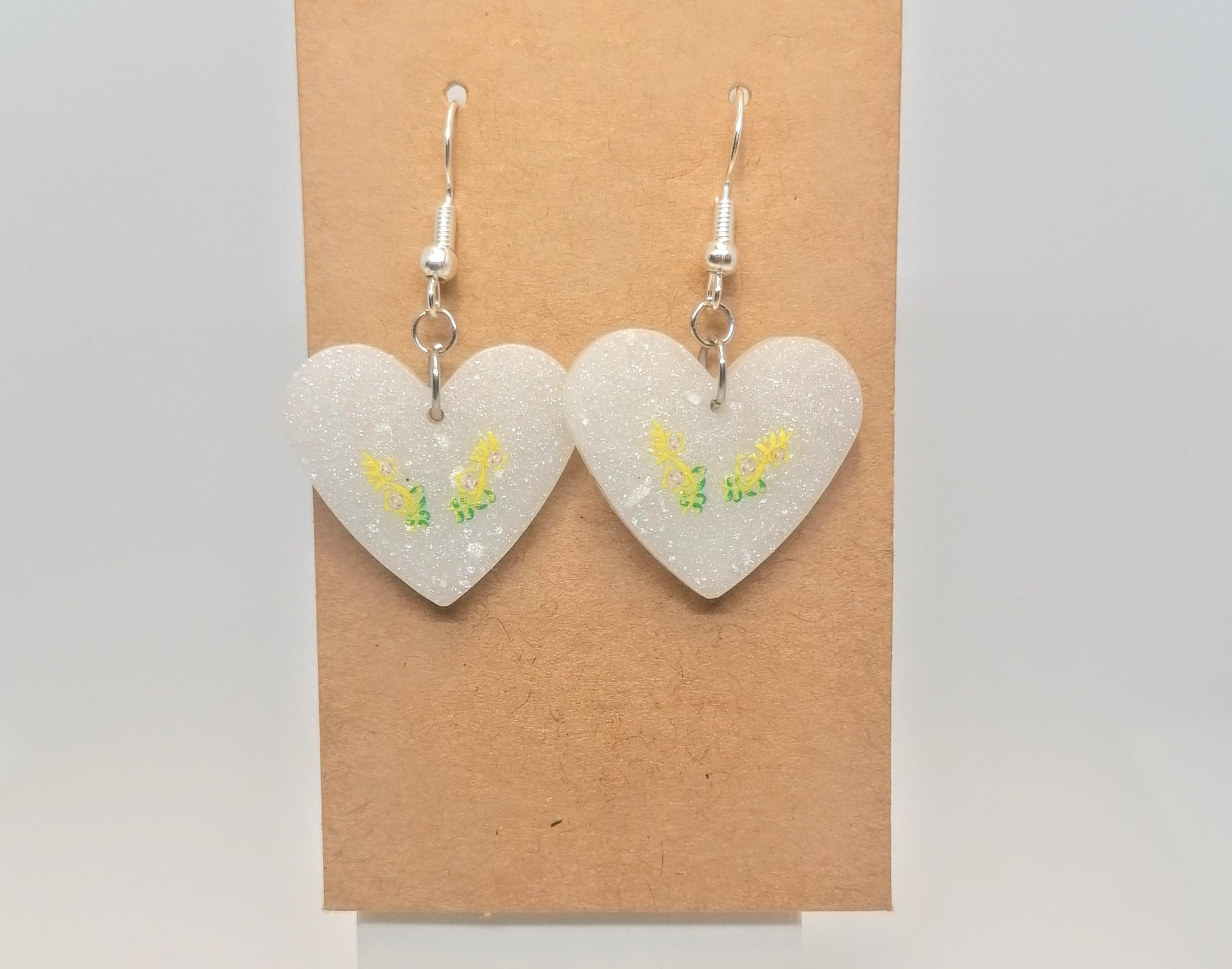 Hopeoitu rauta koukkukorvakoru. Riipus osa on glorexin kidehartsia. Kidehartsi on vaalean sävyinen, ja molemmilla puolilla on pienet tarrat. Seassa myös glitteriä. Tuotteella ilmainen toimitus