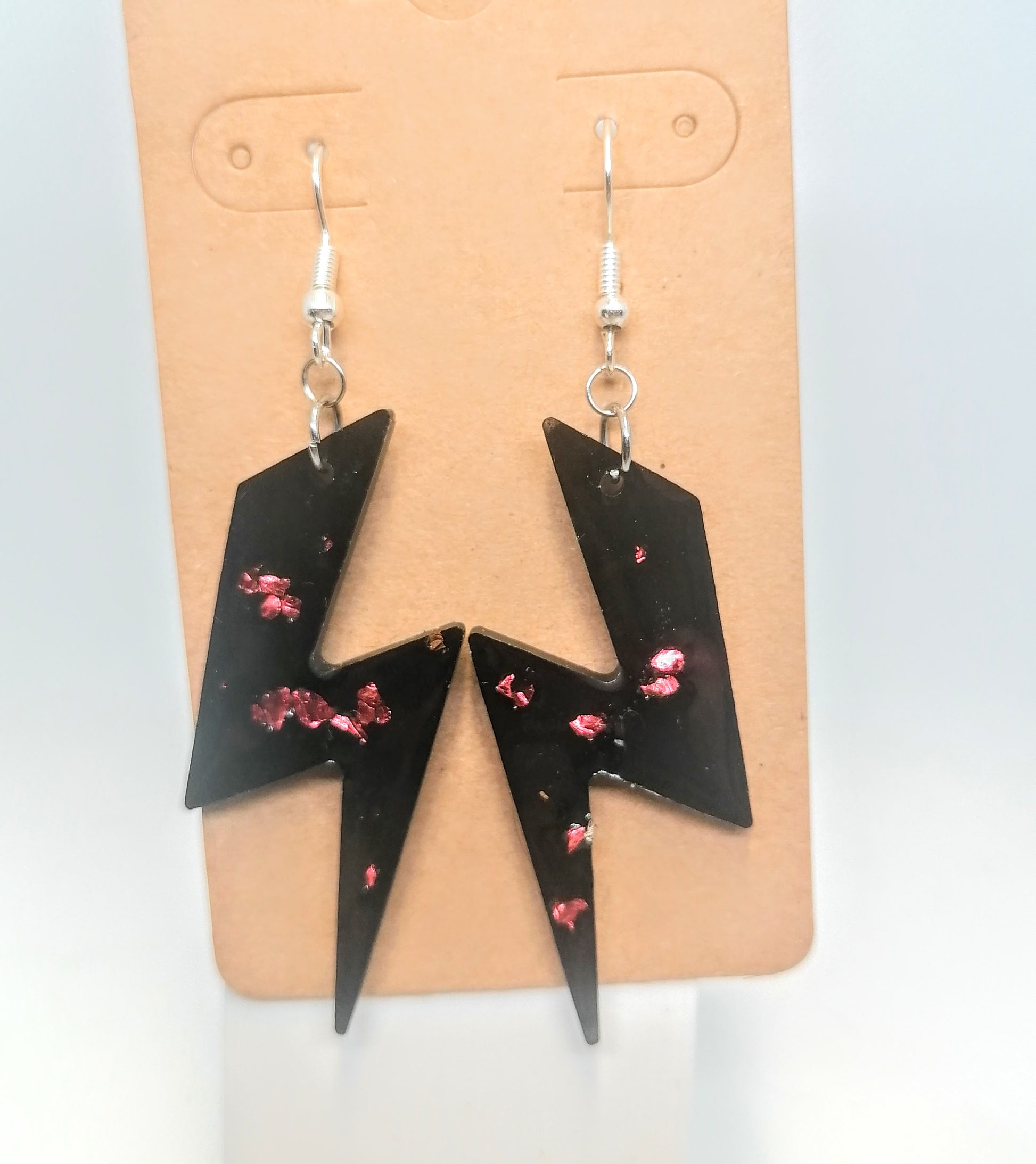 Hopeoitu rauta koukkukorvakoru. Riipus osa on glorexin kidehartsia. Kidehartsi on mustan värinen, ja seassa on punaista lasimurskaa. Tuotteella ilmainen toimitus