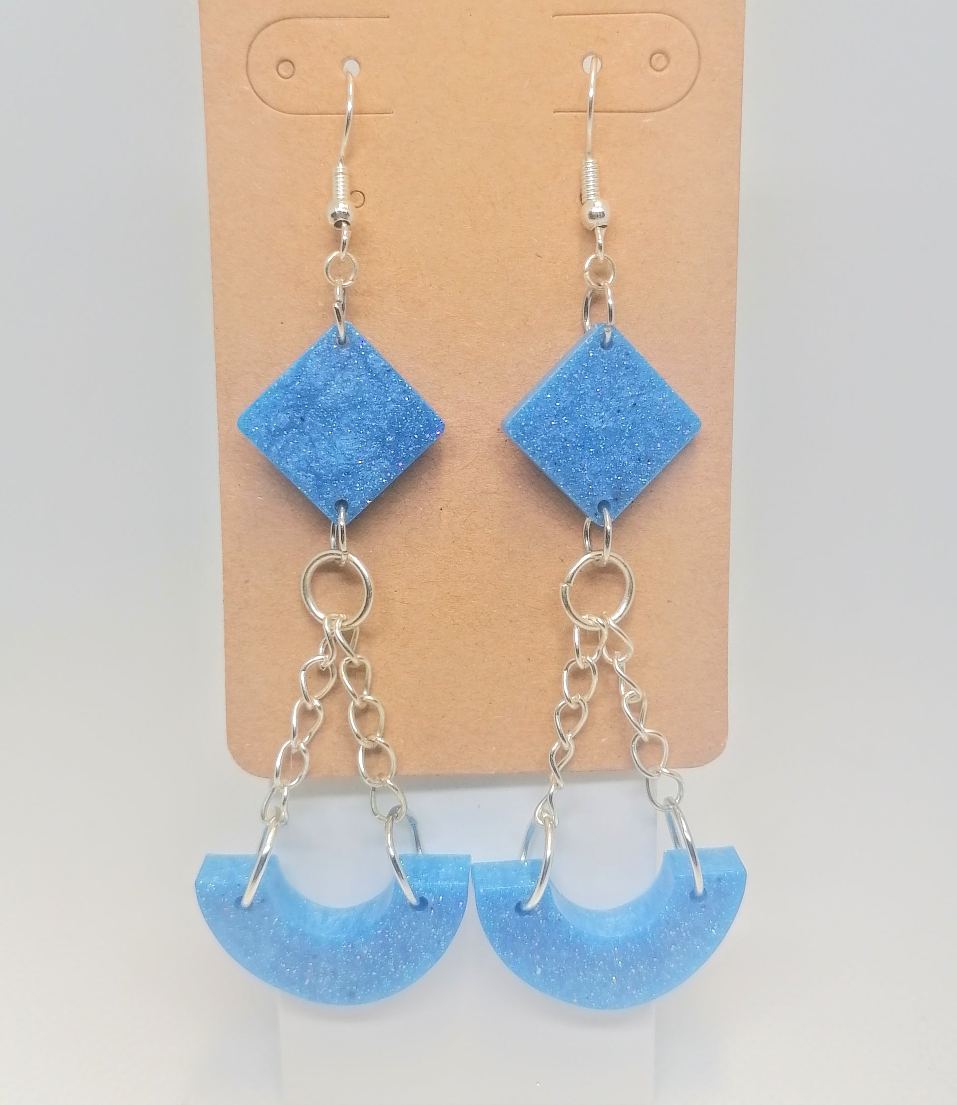 Hopeoitu rauta koukkukorvakoru. Riipus osa on glorexin kidehartsia. Kidehartsi on värjätty siniseksi. Seassa myös glitteriä. Tuotteella ilmainen toimitus