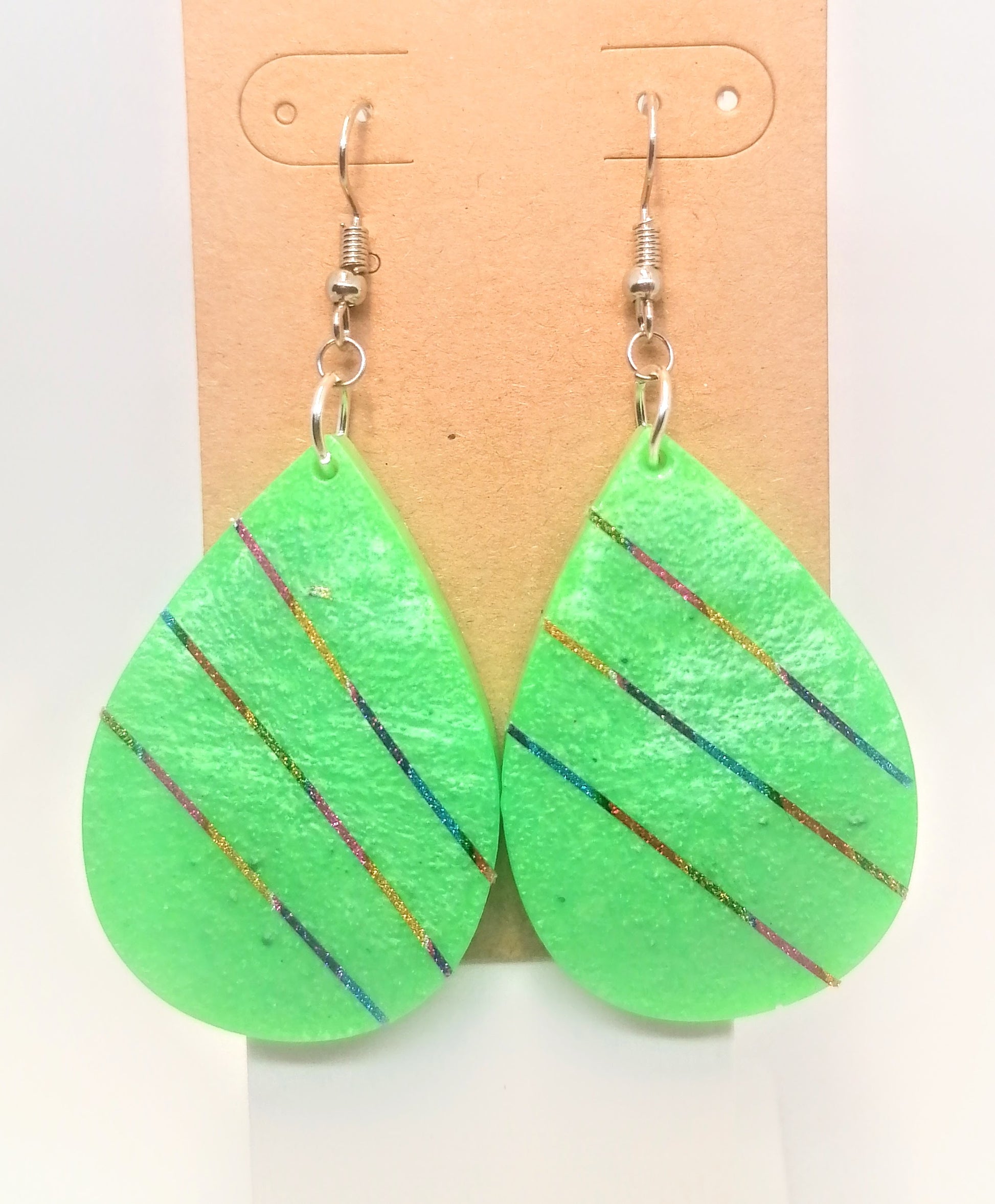 Hopeoitu rauta koukkukorvakoru. Riipus osa on glorexin kidehartsia. Kidehartsi on värjätty vaalean vihreäksi. Päälle on vedetty glitter teippiä, teippi on kovetettu uv-geelillä. Tuotteella ilmainen toimitus