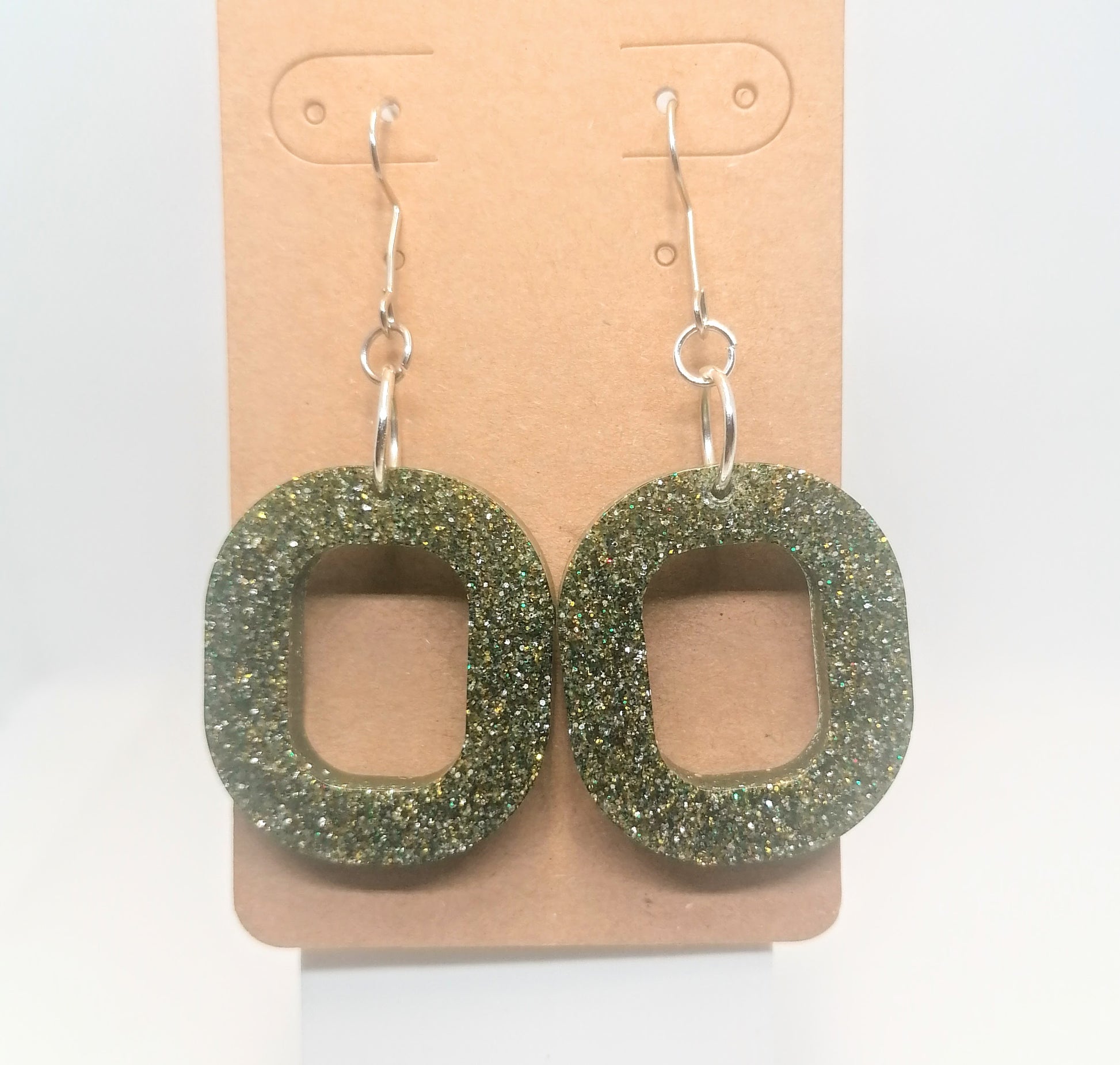 Hopeoitu rauta koukkukorvakoru. Riipus osa on glorexin kidehartsia. Kidehartsi on värjätty tumman vihreäksi. Seassa on myös glitteriä. Tuotteella ilmainen toimitus