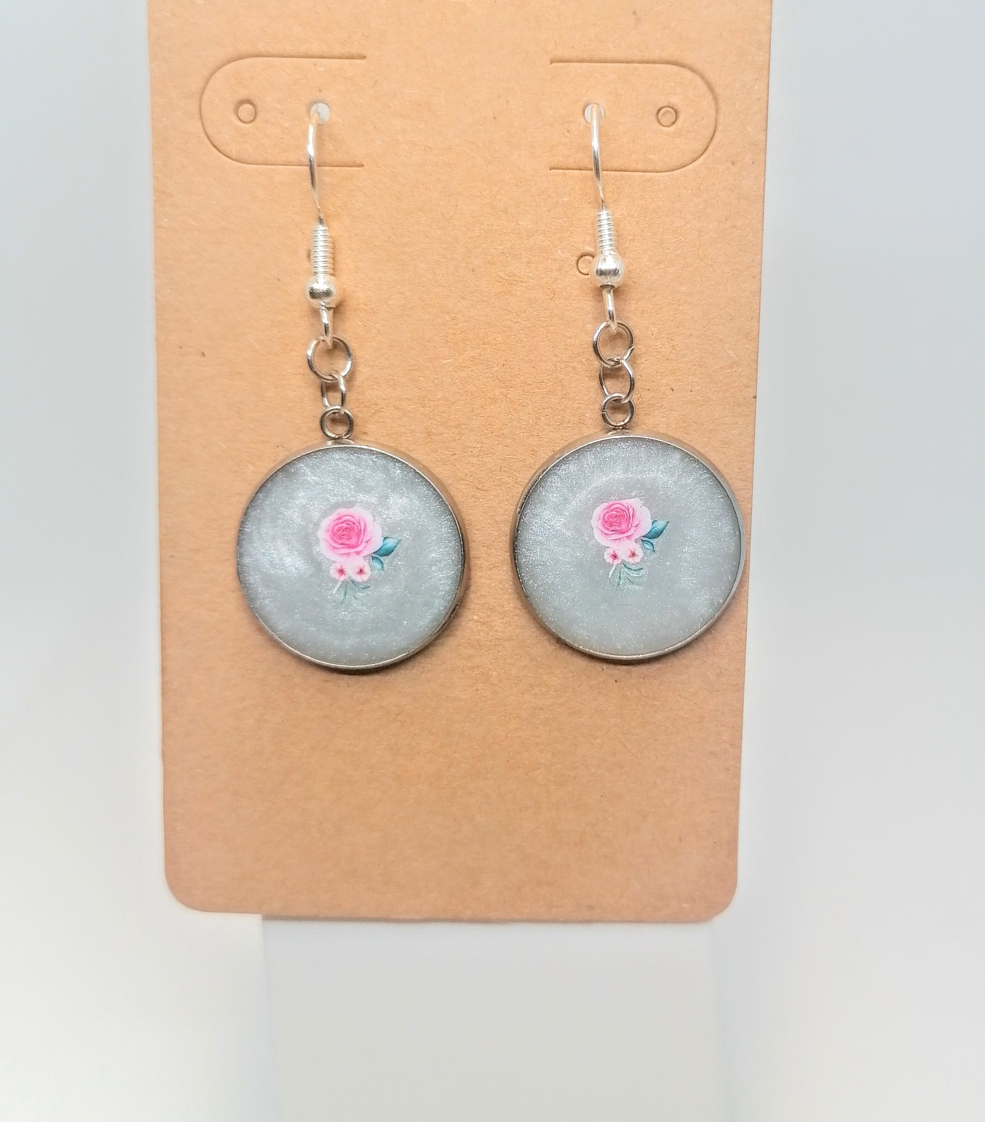 Hopeoitu rauta koukkukorvakoru. Riipuksena on kapussi, joka on täytetty kidehartsilla molemmin puolin. Hartsin värinä on hopea. Pintaan on kovetettu tarrat molemmilla puolilla. Tuotteella ilmainen toimitus.
