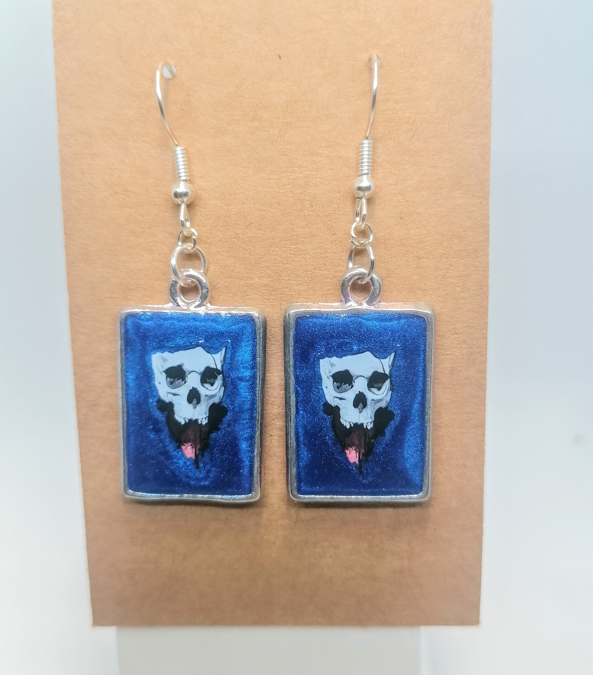 Hopeoitu rauta koukkukorvakoru. Riipuksena on kapussi, joka on täytetty kidehartsilla molemmin puolin. Hartsin värinä on sininen. Pintaan on kovetettu tarrat molemmilla puolilla. Tuotteella ilmainen toimitus.