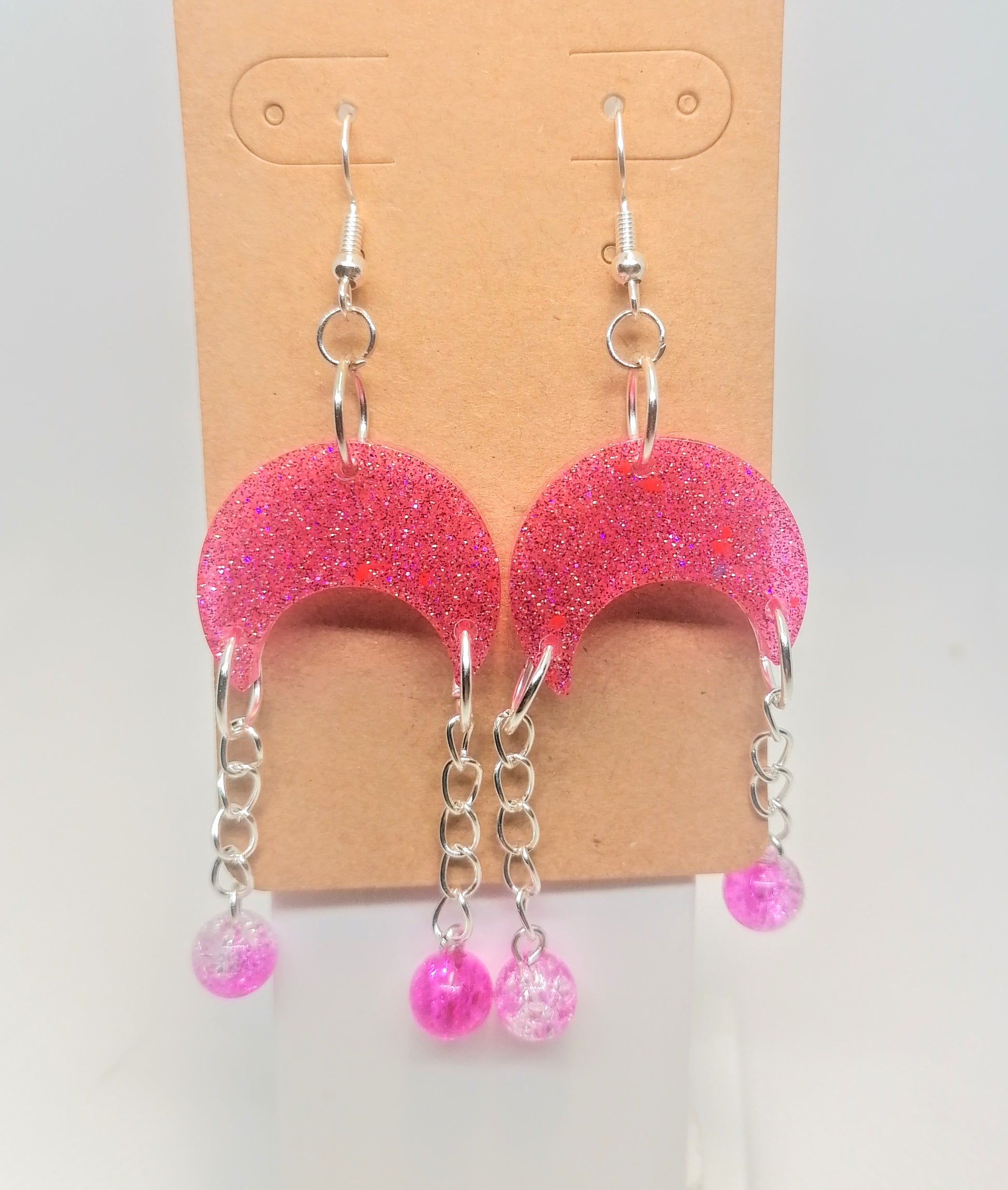 Hopeoitu rauta koukkukorvakoru. Riipus osa on glorexin kidehartsia. Kidehartsi on värjätty pinkiksi. Seassa on myös glitteriä. Riipuksesta roikkuu figaro ketjut joissa on helmet. Tuotteella ilmainen toimitus