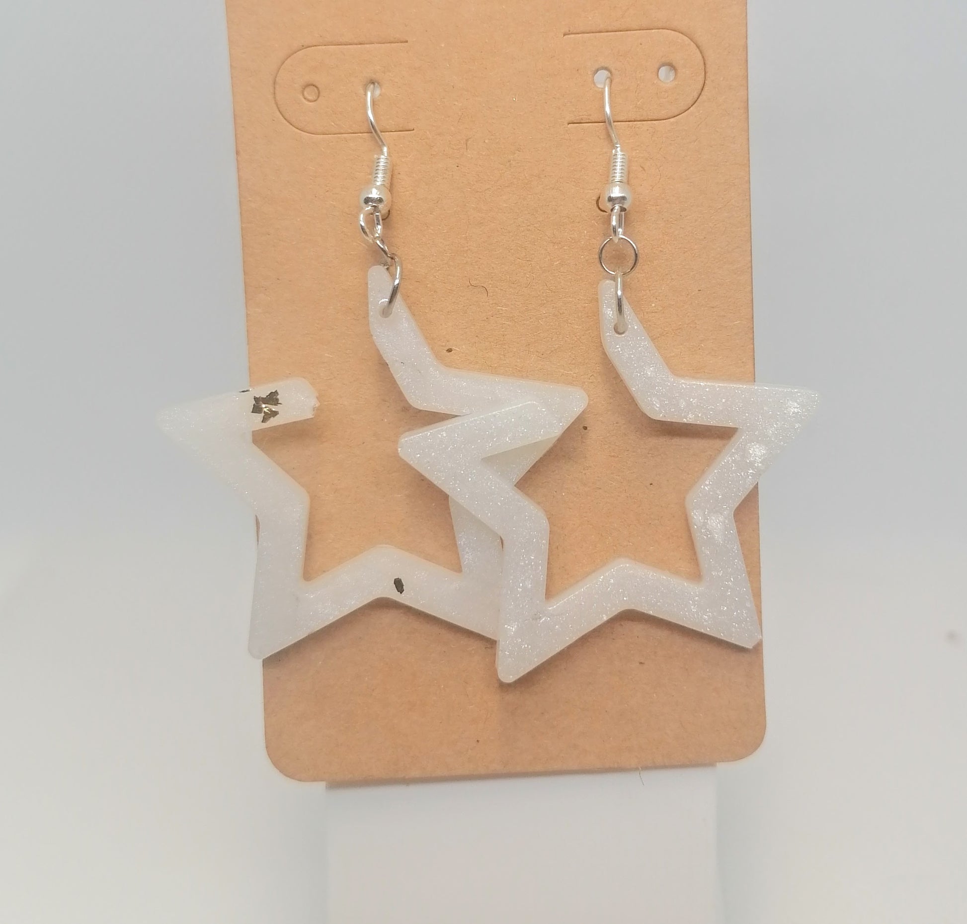 Hopeoitu rauta koukkukorvakoru. Riipus osa on glorexin kidehartsia. Kidehartsi on värjätty hopean sävyyn. Toiseen koruun on päässyt pieni pala lehtikultaa. Tuotteella ilmainen toimitus