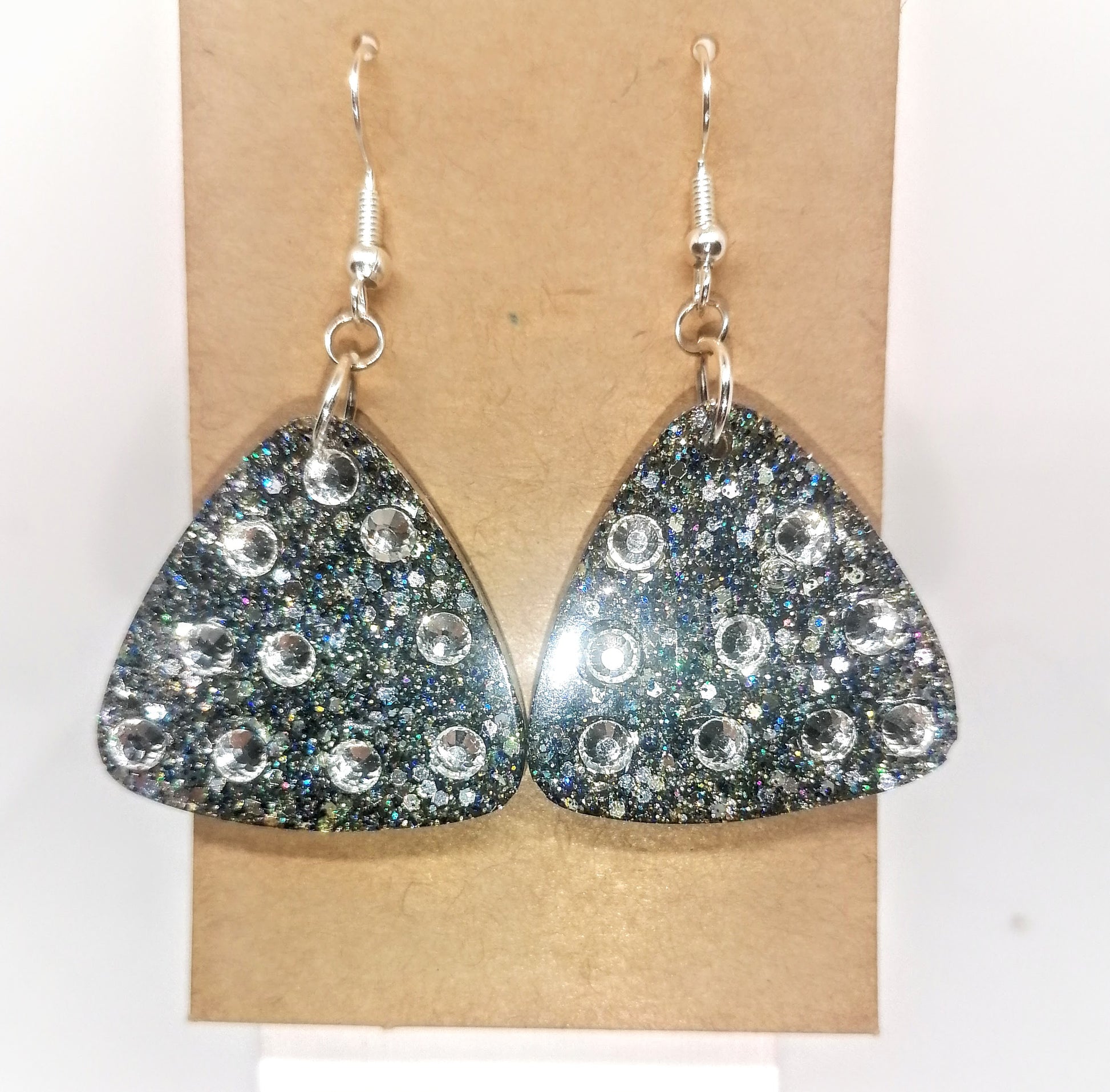 Hopeoitu rauta koukkukorvakoru. Riipus osa on glorexin kidehartsia. Kidehartsi on värjätty mustan ja violetin sävyiseksi. Etupuolella on koristeita. Seassa on myös glitteriä. Tuotteella ilmainen toimitus