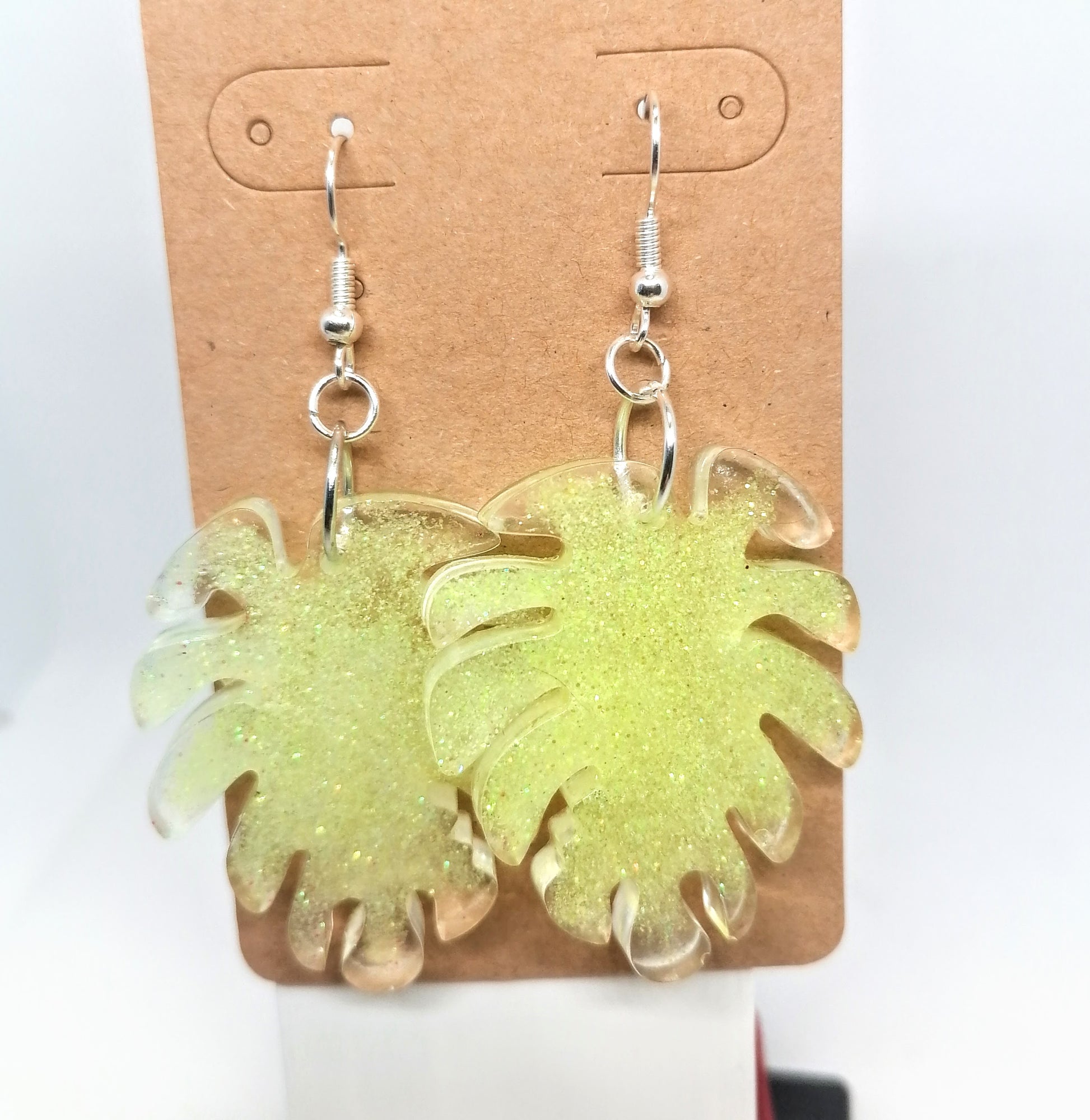 Hopeoitu rauta koukkukorvakoru. Riipus osa on glorexin kidehartsia. Kidehartsin seassa on vaalean vihreää glitteriä. Tuotteella ilmainen toimitus