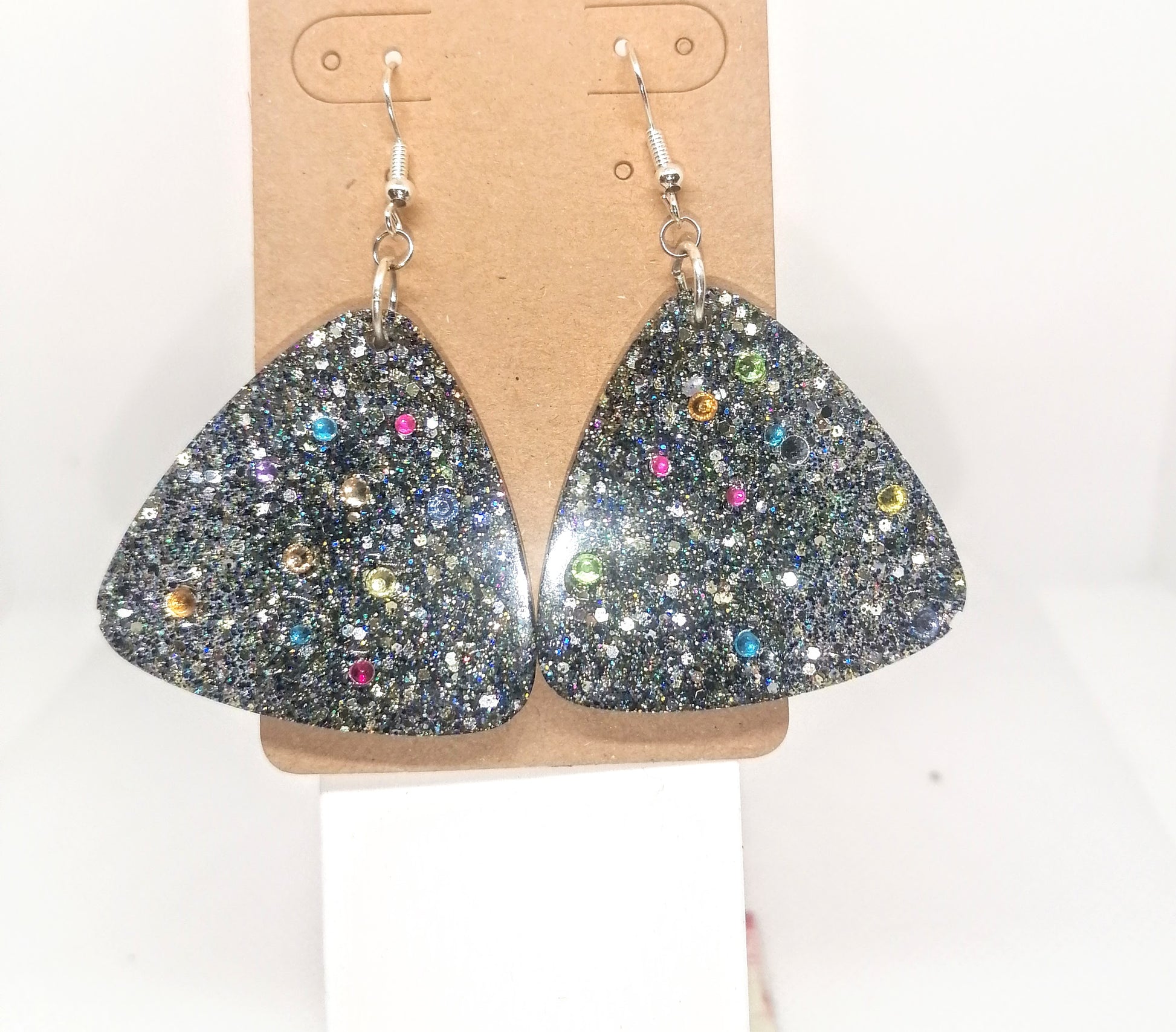 Hopeoitu rauta koukkukorvakoru. Riipus on glorexin kidehartsia, joka on kirkasta, seassa on glitteriä ja hilettä niin ettei kirkas väri näy Etupuolella on timantteja. Tuotteella ilmainen toimitus.