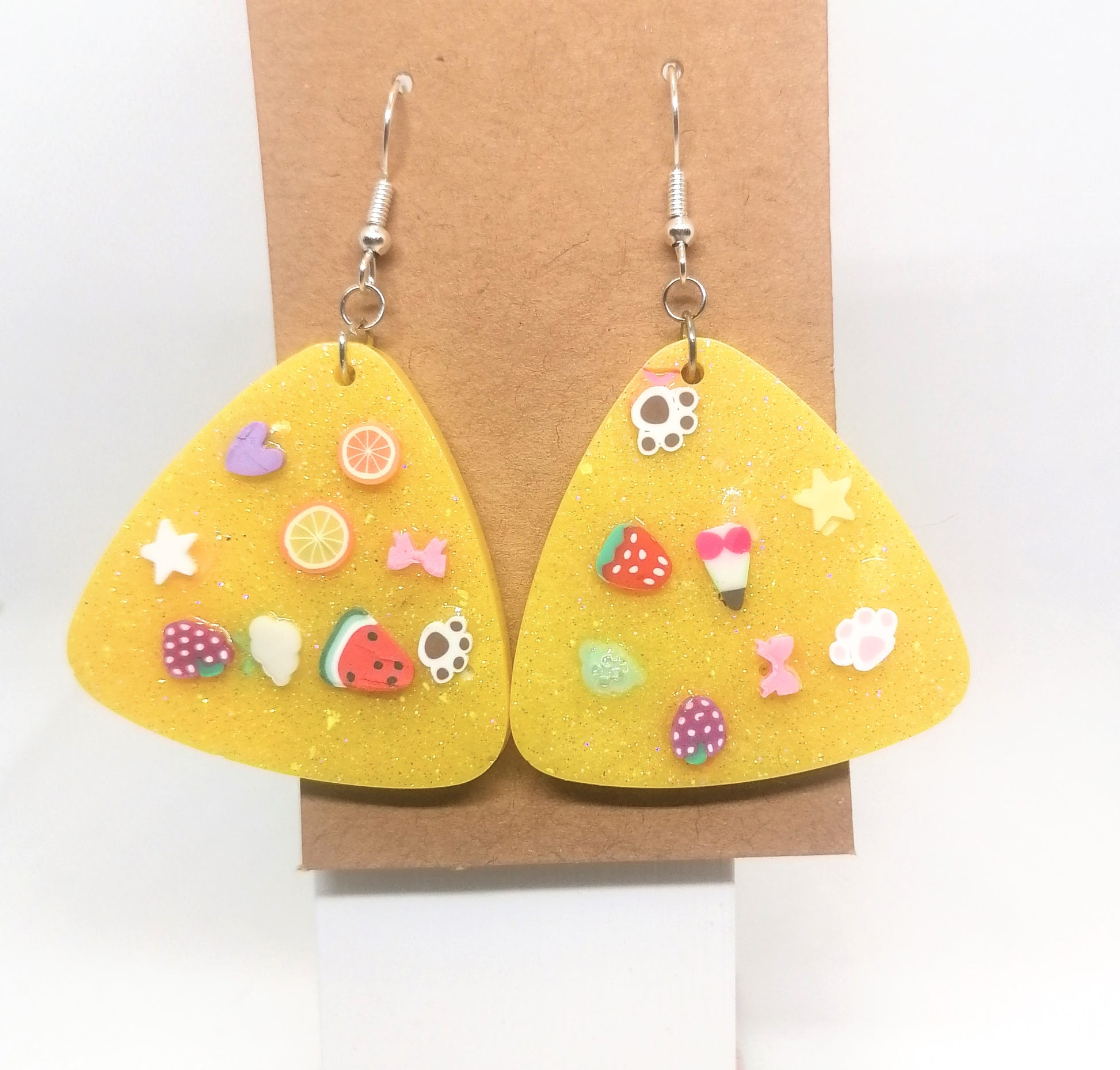 Hopeoitu rauta koukkukorvakoru. Riipus on glorexin kidehartsia, joka on värjätty keltaiseksi. Etupuolella koristeita. Seassa myös glitteriä. Tuotteella ilmainen toimitus.