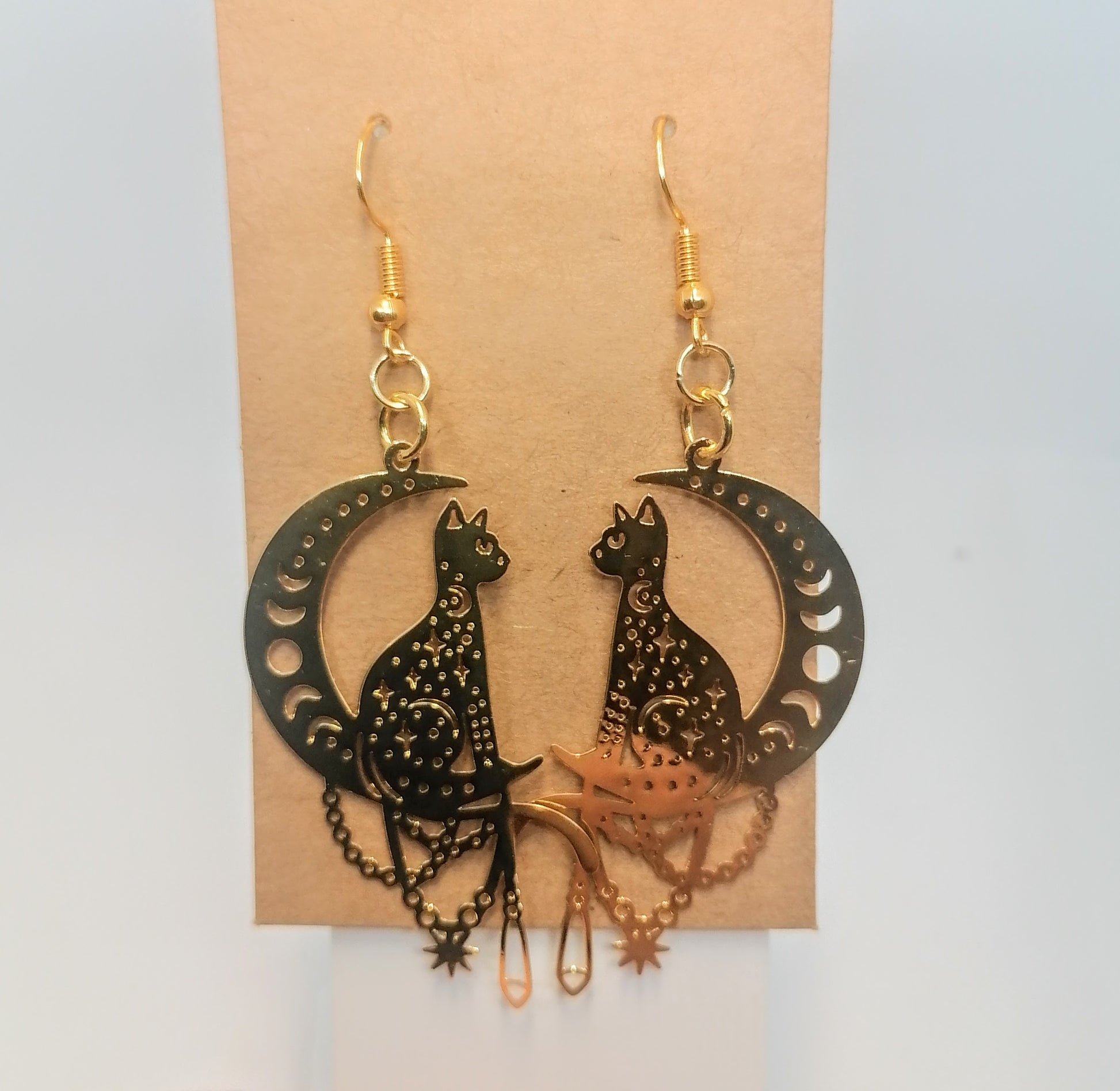 Kullan värinen rauta koukkukorvakoru. Riipuksena on kullanvärinen kissa. Tuotteella ilmainen toimitus.