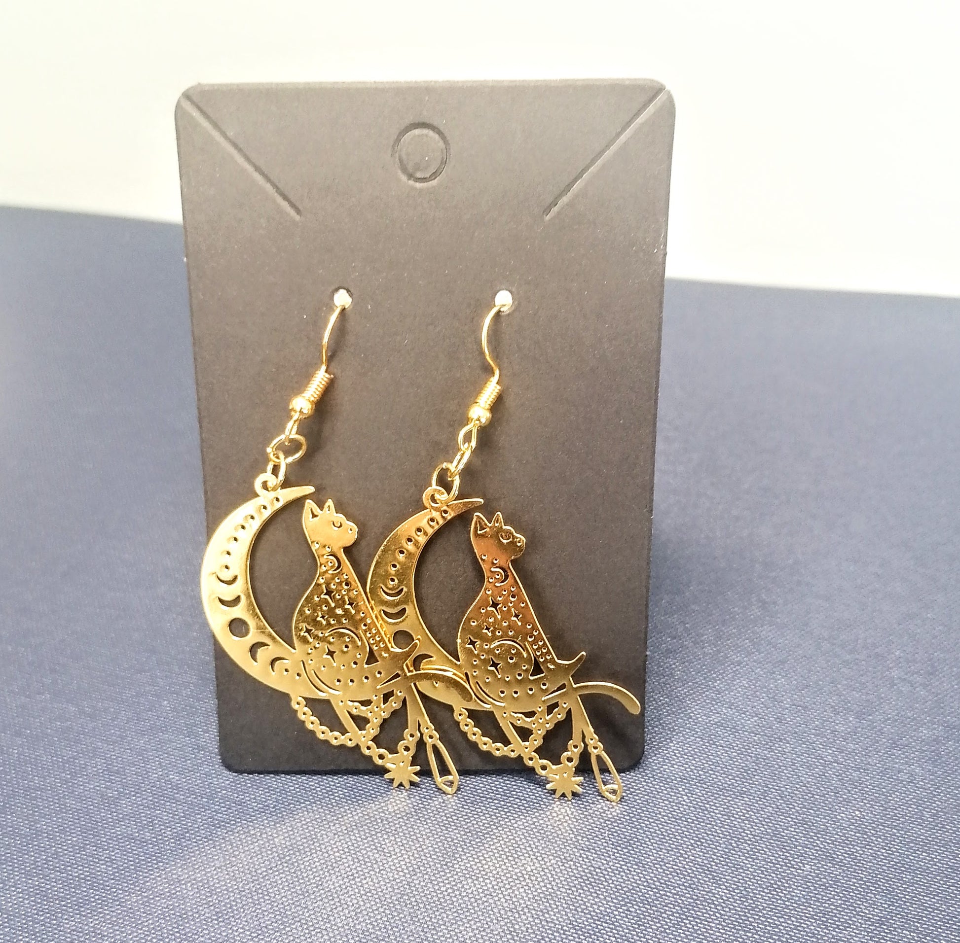 Kullanvärinen rauta koukkukorvakoru. Riipuksena kullanvärinen kissa istumassa kuunsirpillä. Tuotteella ilmainen toimitus.