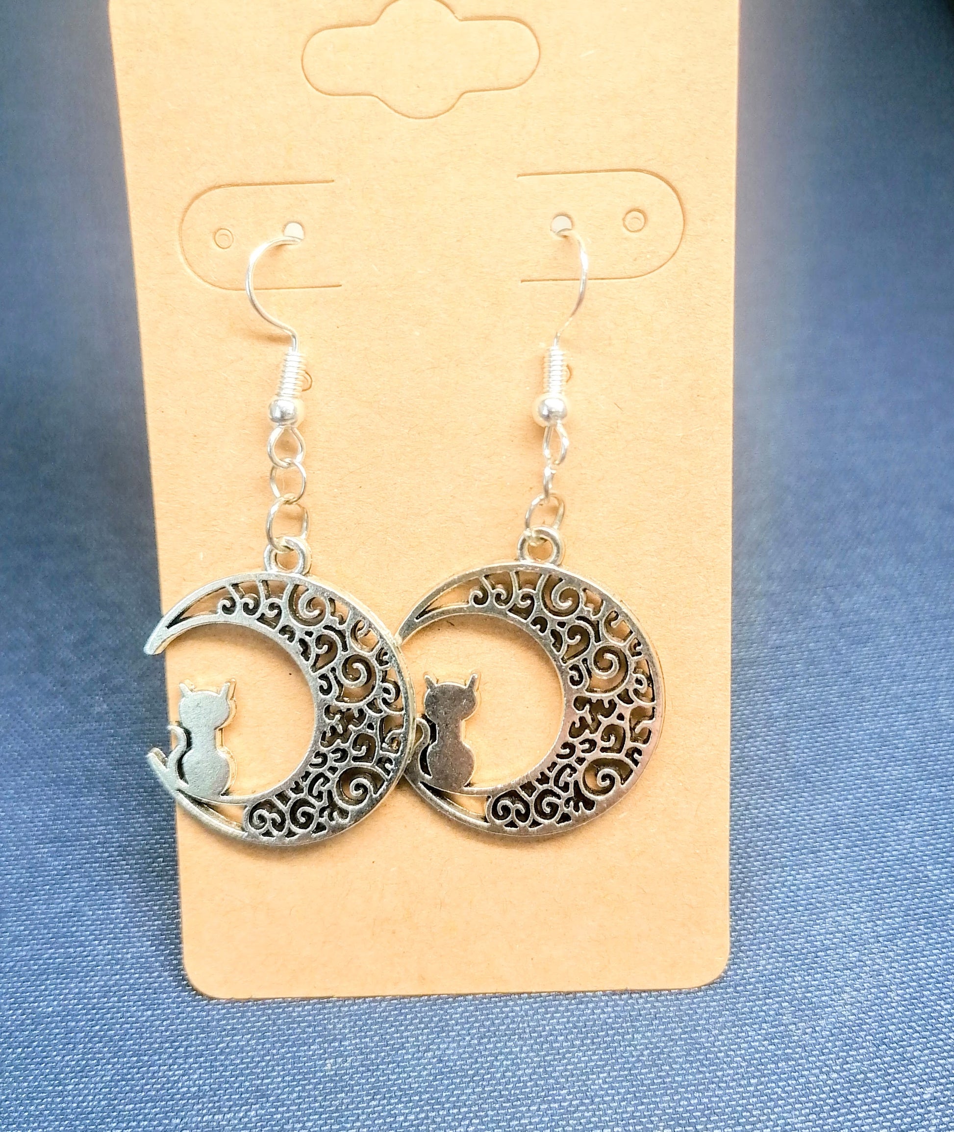Hopeanvärinen rauta koukkukorvakoru. Riipuksena hopeanvärinen kissa kuunsirpillä. Tuotteella ilmainen toimitus.
