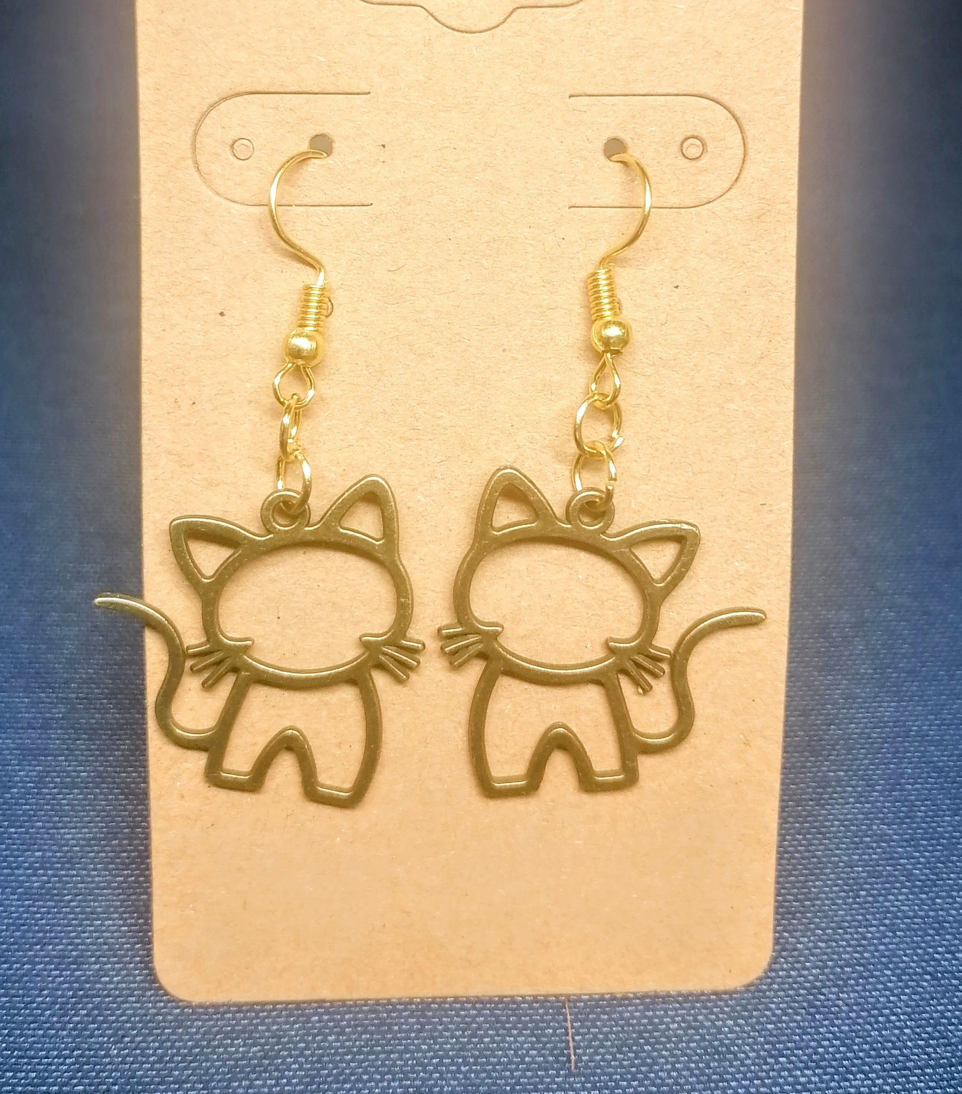 Kullanvärinen rauta koukkukorvakoru. Riipuksena pronssin värinen kissa. Tuotteella ilmainen toimitus.