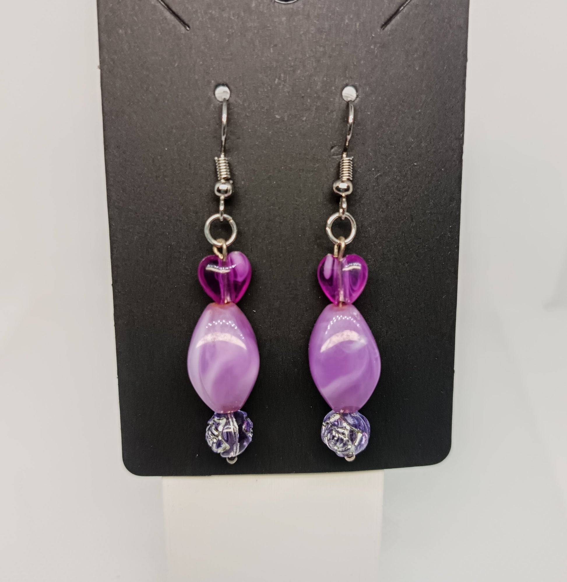 Hopeanvärinen rauta koukkukorvakoru. Riipuksena on violetti muovi kivi sydämellä ja helmellä. Tuotteella ilmainen toimitus.