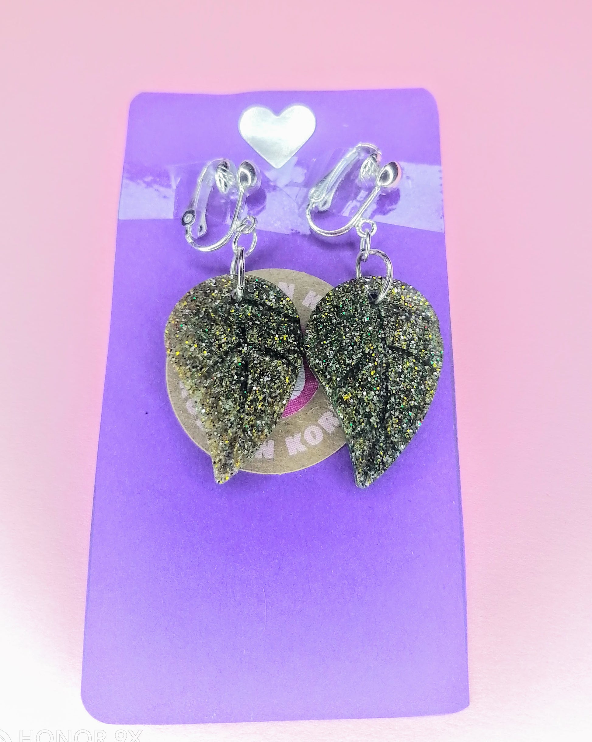 Hopeanvärinen rauta klipsi korvakoru. Riipus on glorexin kidehartsia, joka on värjätty mustan/vihreään sävyyn, seassa on myös glitteriä. Tuotteella ilmainen toimitus.
