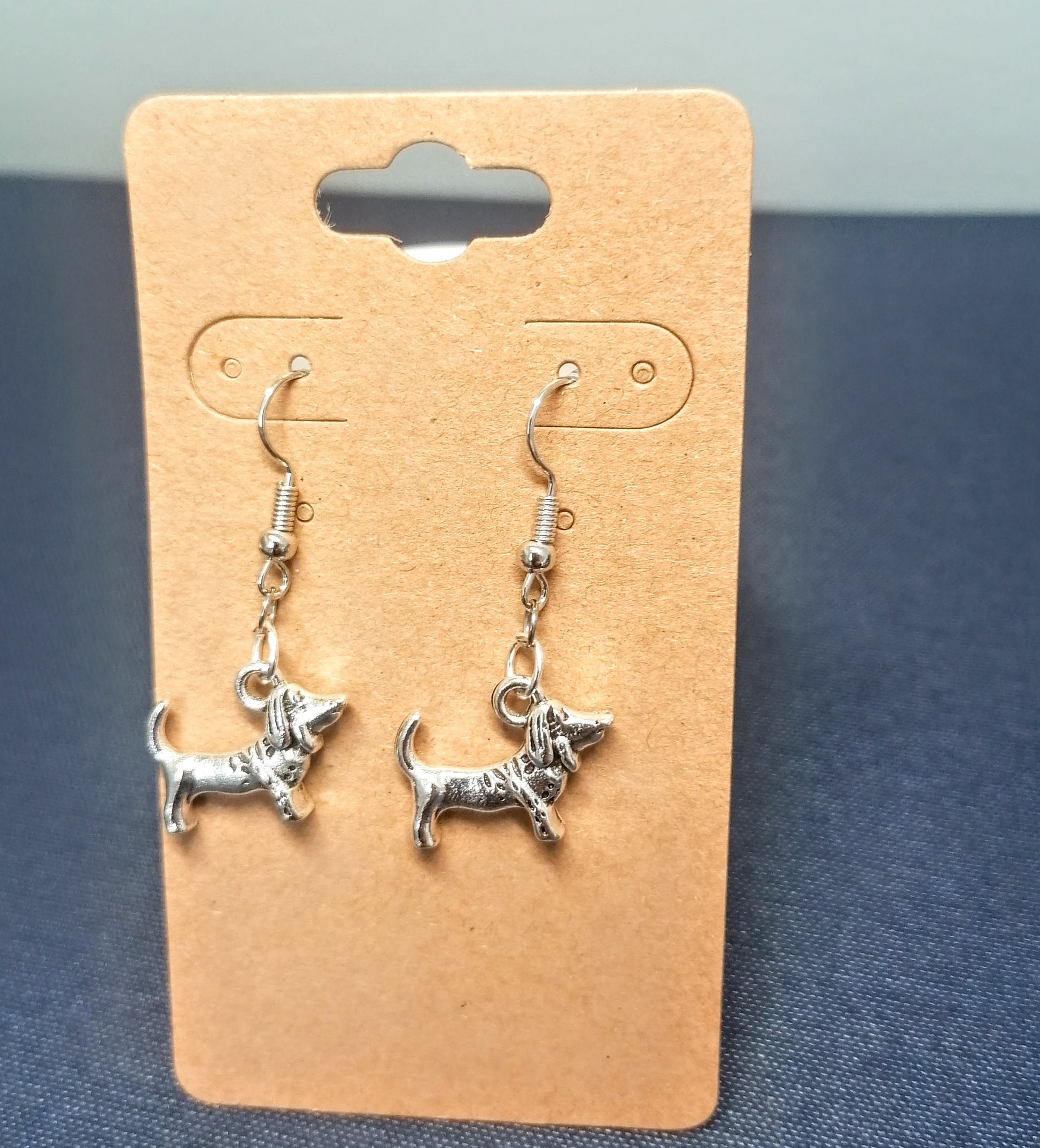 Hopeanvärinen rauta koukkukorvakoru. Riipuksena hopeanvärinen koira. Tuotteella ilmainen toimitus.