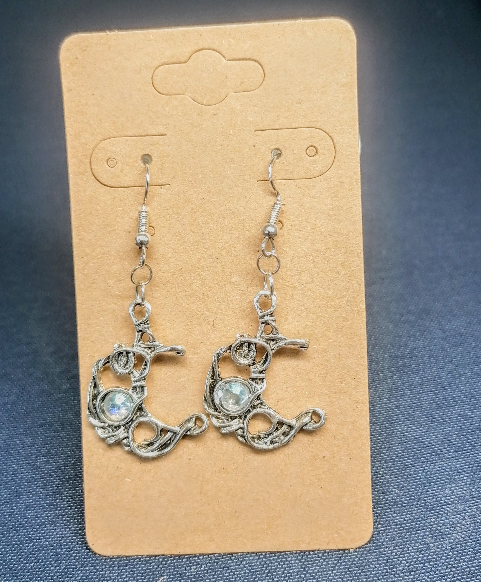 Hopeanvärinen rauta koukkukorvakoru. Riipuksena hopeanvärinen kuunsirppi pienellä puolitimantilla . Tuotteella ilmainen toimitus.