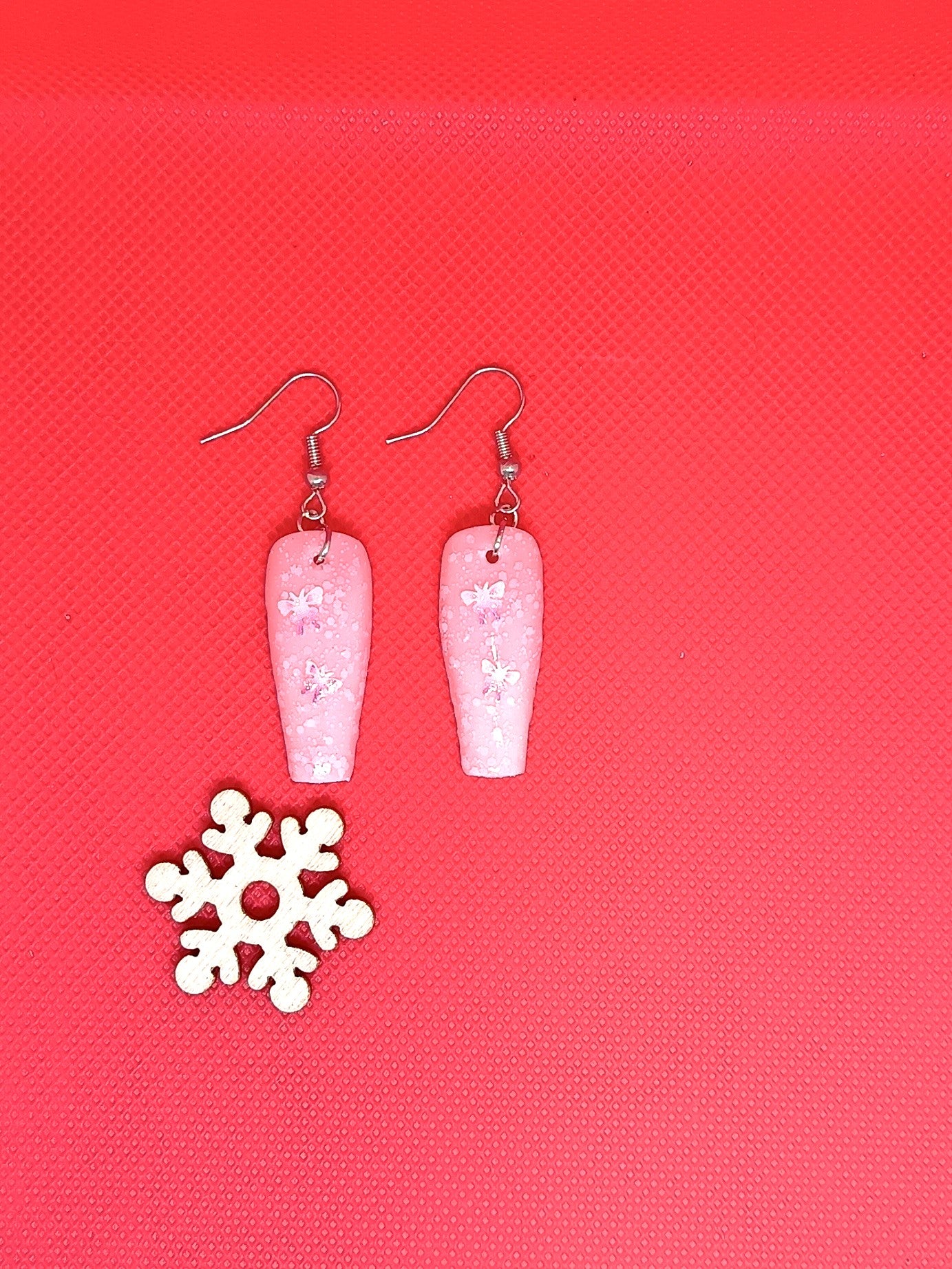 Press On kynnestä tehty koru. Päällä geelilakka, pinkki hilelakka. Molemmilla puolilla pienet tarrat. Korussa hopeoitu koukku. Nikkelitön ja allergiatestattu. Tuotteella ilmainen toimitus.