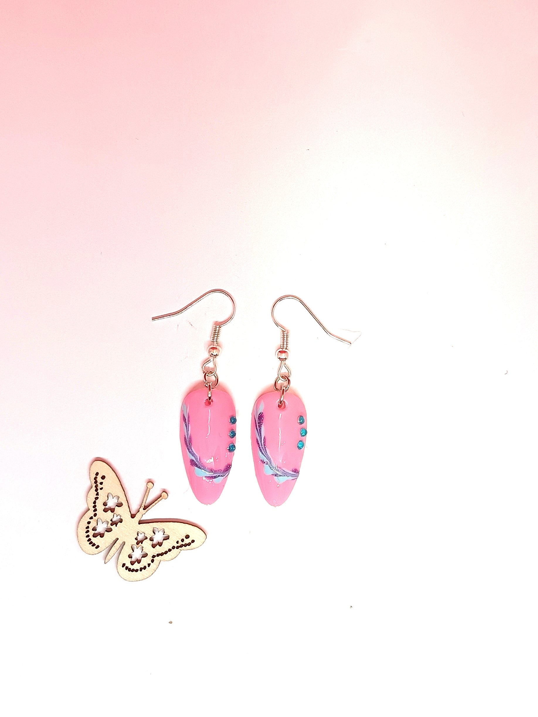 Press On kynnestä tehty koru. Päällä geelilakka. Etupuolella on pieniä timantteja. Korussa hopeoitu koukku. Nikkelitön ja allergiatestattu. Tuotteella ilmainen toimitus.
