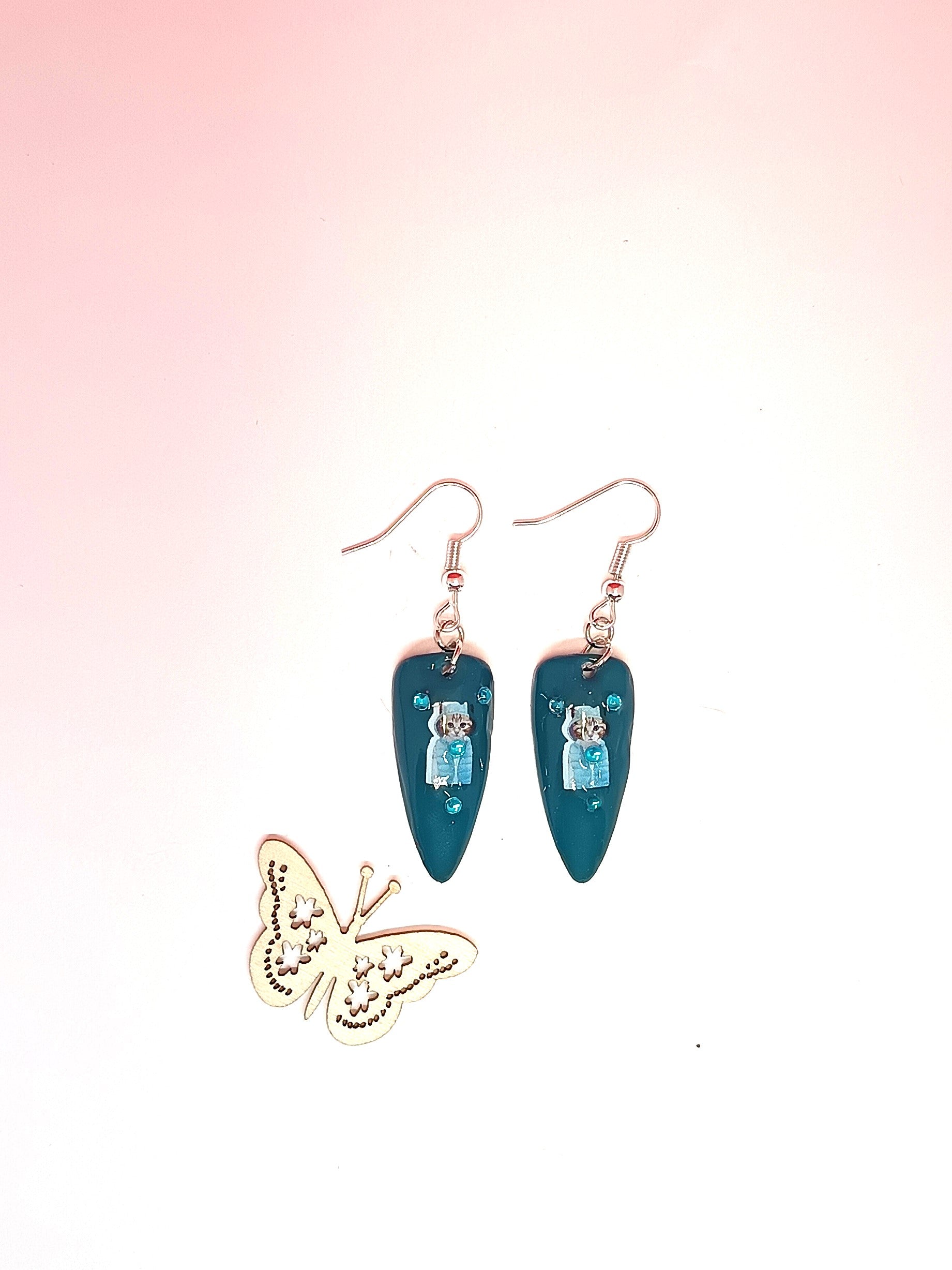 Press On kynnestä tehty koru. Päällä geelilakka. Etupuolella tarrat ja timantteja. Korussa hopeoitu koukku. Nikkelitön ja allergiatestattu. Tuotteella ilmainen toimitus.