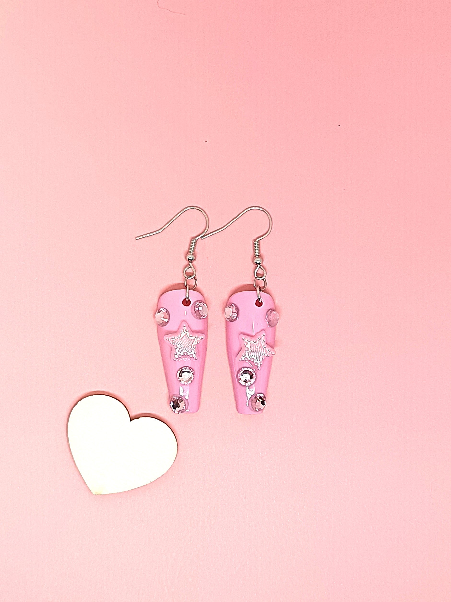 Press On kynnestä tehty koru. Päällä geelilakka. Koristeet molemmin puolin. Korussa hopeoitu koukku. Nikkelitön ja allergiatestattu. Tuotteella ilmainen toimitus.