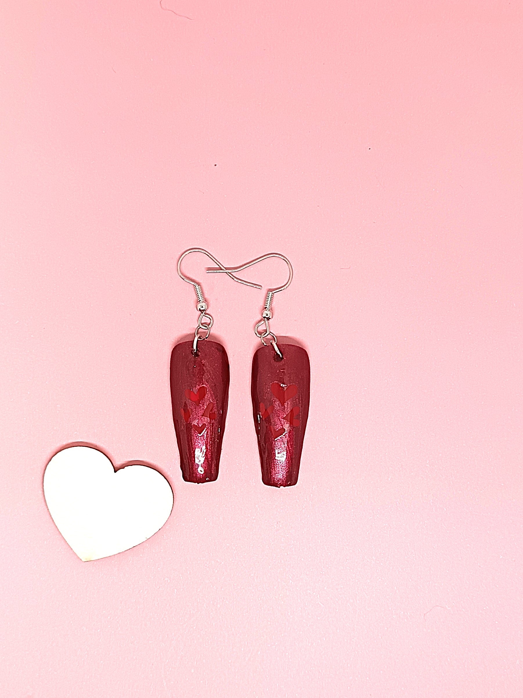 Press On kynnestä tehty koru. Päällä geelilakka. Molemmilla puolilla sydän tarrat. Korussa hopeoitu koukku. Nikkelitön ja allergiatestattu. Tuotteella ilmainen toimitus.