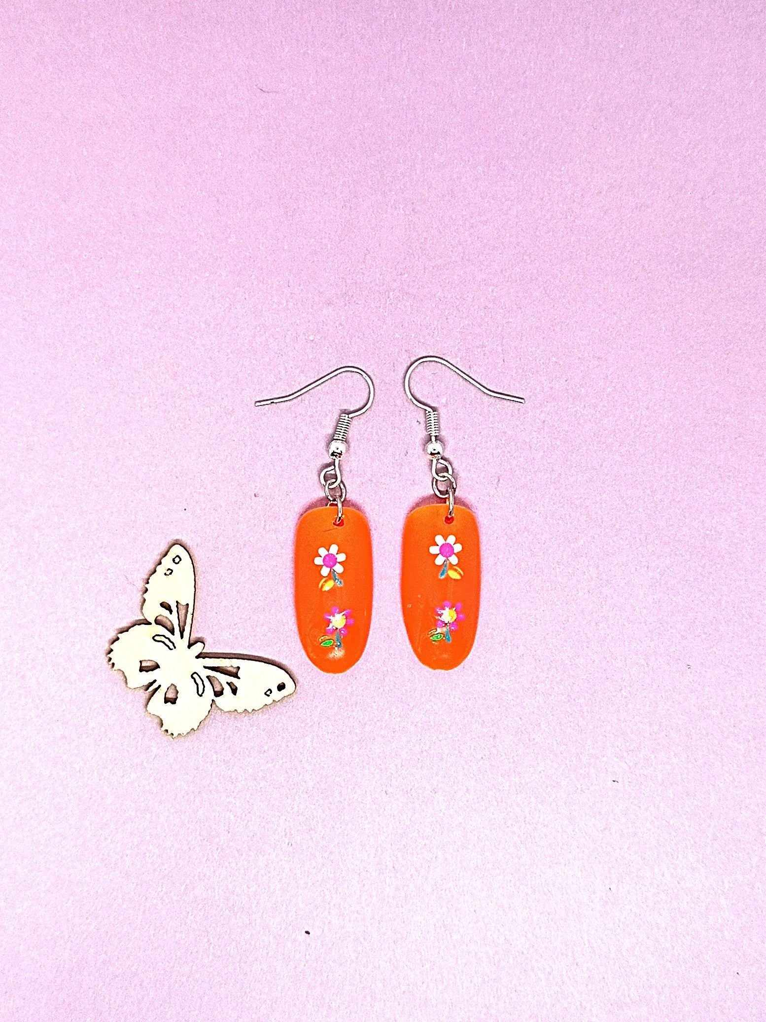 Press On kynnestä tehty koru. Päällä geelilakka. Molemmilla puolilla kukka tarrat. Korussa hopeoitu koukku. Nikkelitön ja allergiatestattu. Tuotteella ilmainen toimitus.