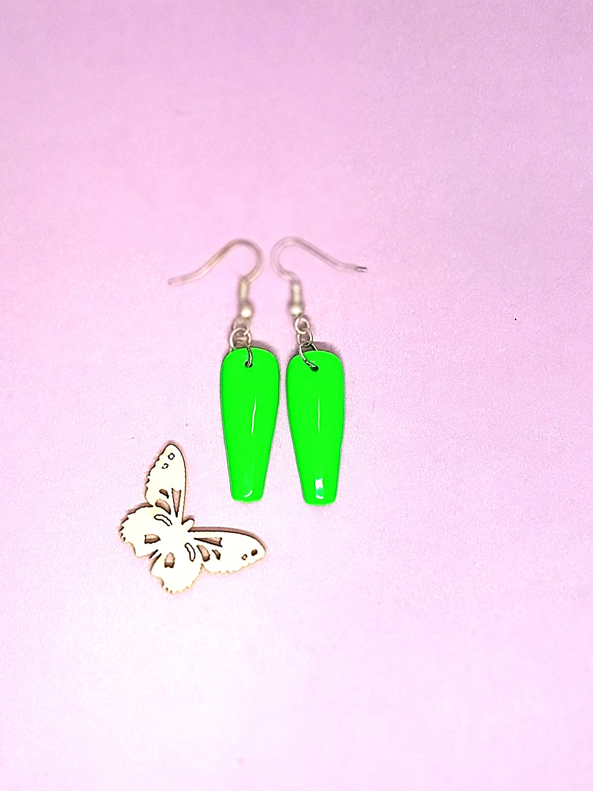 Press On kynnestä tehty koru. Päällä geelilakka. Korussa hopeoitu koukku. Nikkelitön ja allergiatestattu. Tuotteella ilmainen toimitus.
