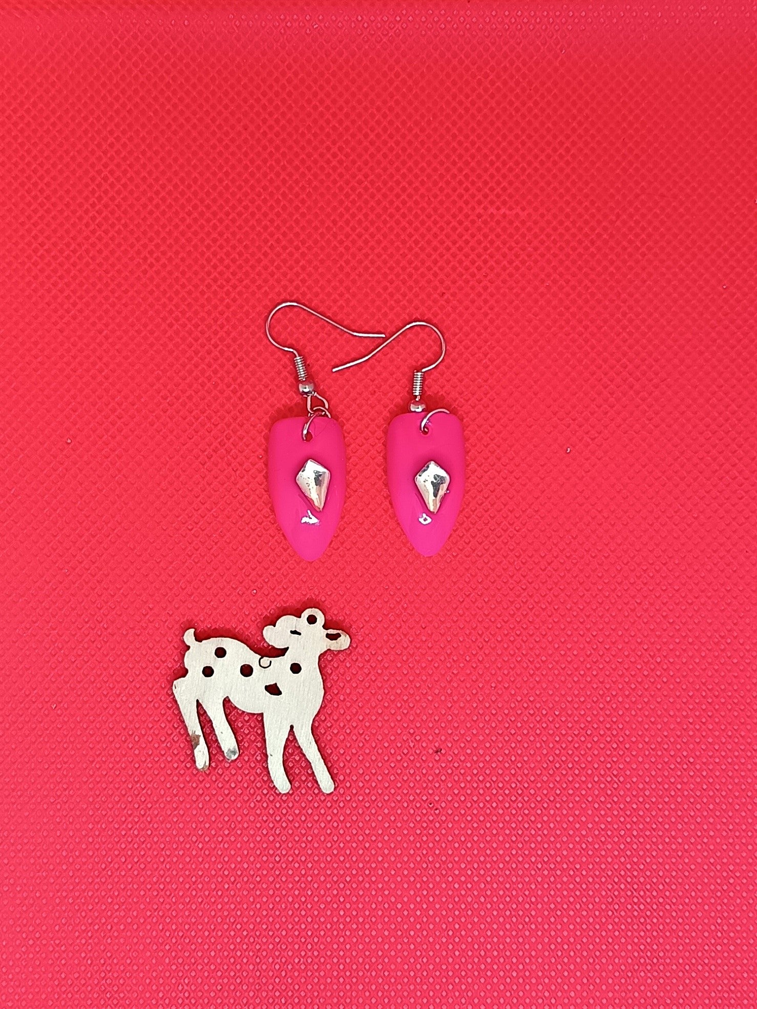 Press On kynnestä tehty koru. Päällä geelilakka. Molemmilla puolilla on koristeet. Korussa hopeoitu koukku. Nikkelitön ja allergiatestattu. Tuotteella ilmainen toimitus.