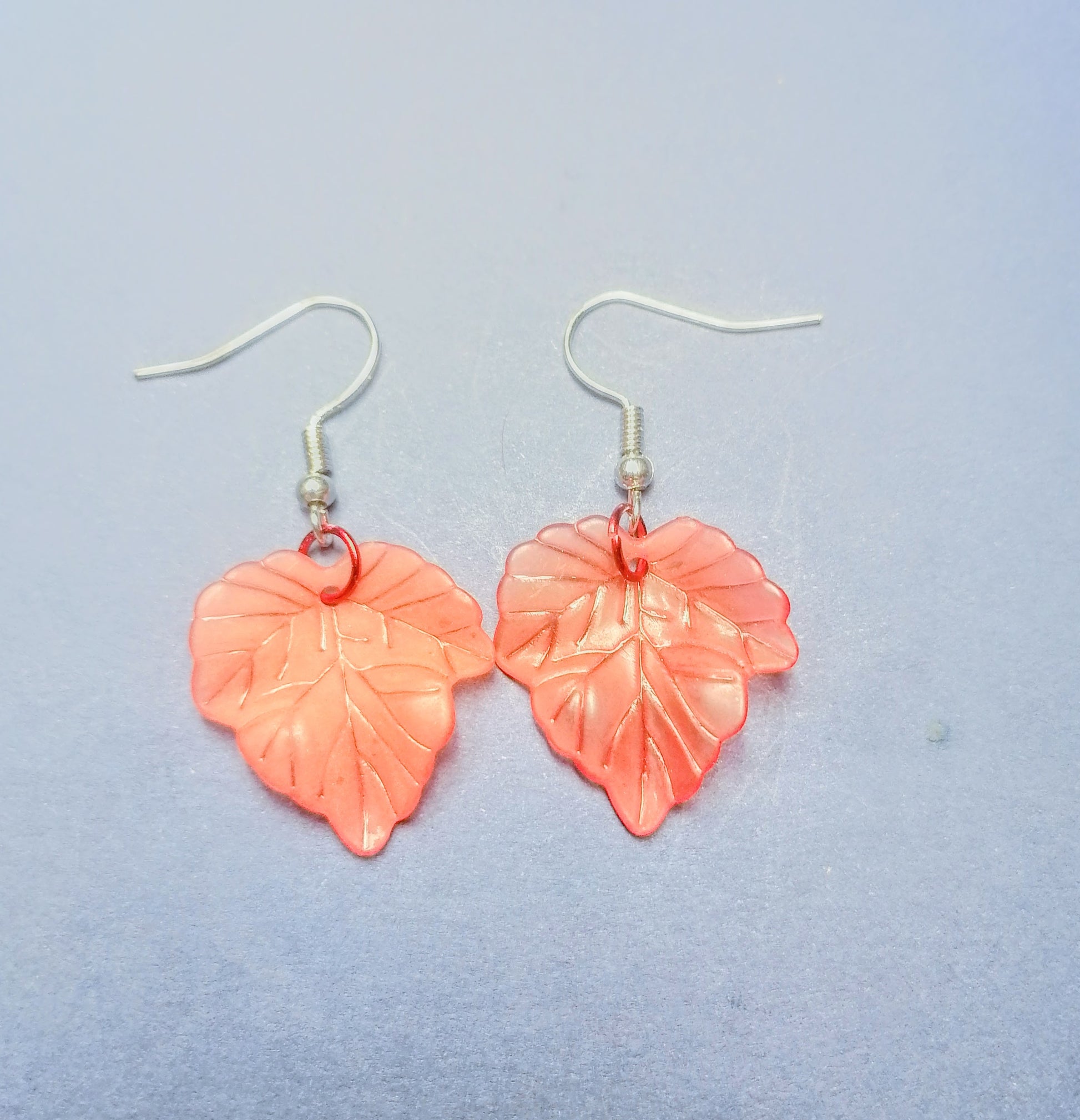 Hopeoitu rauta koukkukorvakoru. Riipuksena punertava akryllilehti. Tuotteella ilmainen toimitus.