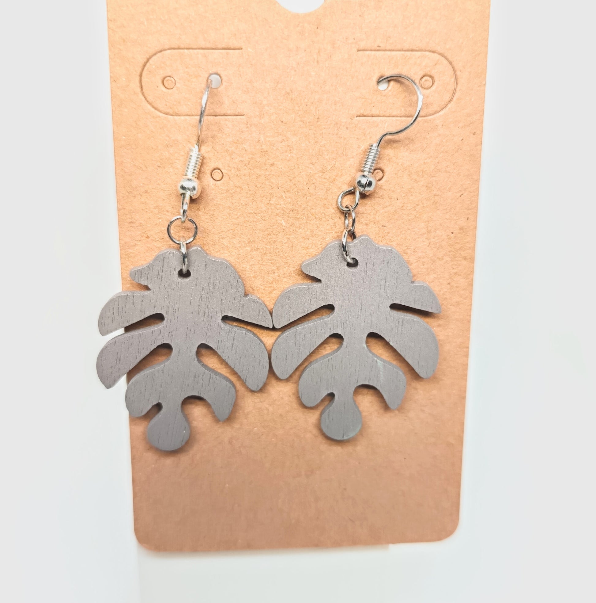 Hopeanvärinen rauta koukkukorvakoru. Riipuksena on puinen harmaa lehti. Tuotteella ilmainen toimitus.