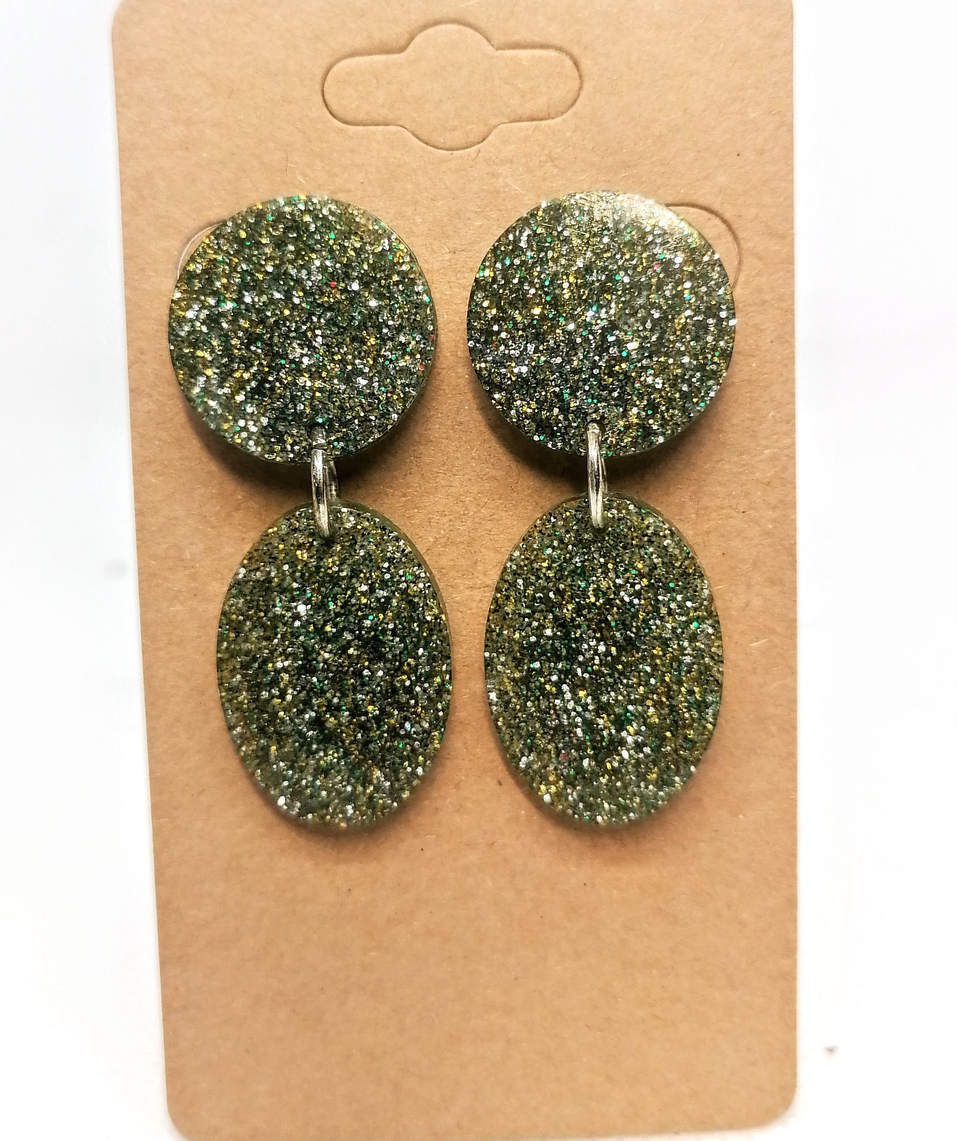 Hopeanvärinen nappikorvakoru. Riipus on glorexin kidehartsia, joka on värjätty vihreän sävyyn. Seassa myös glitteriä. Tuotteella on ilmainen toimitus.