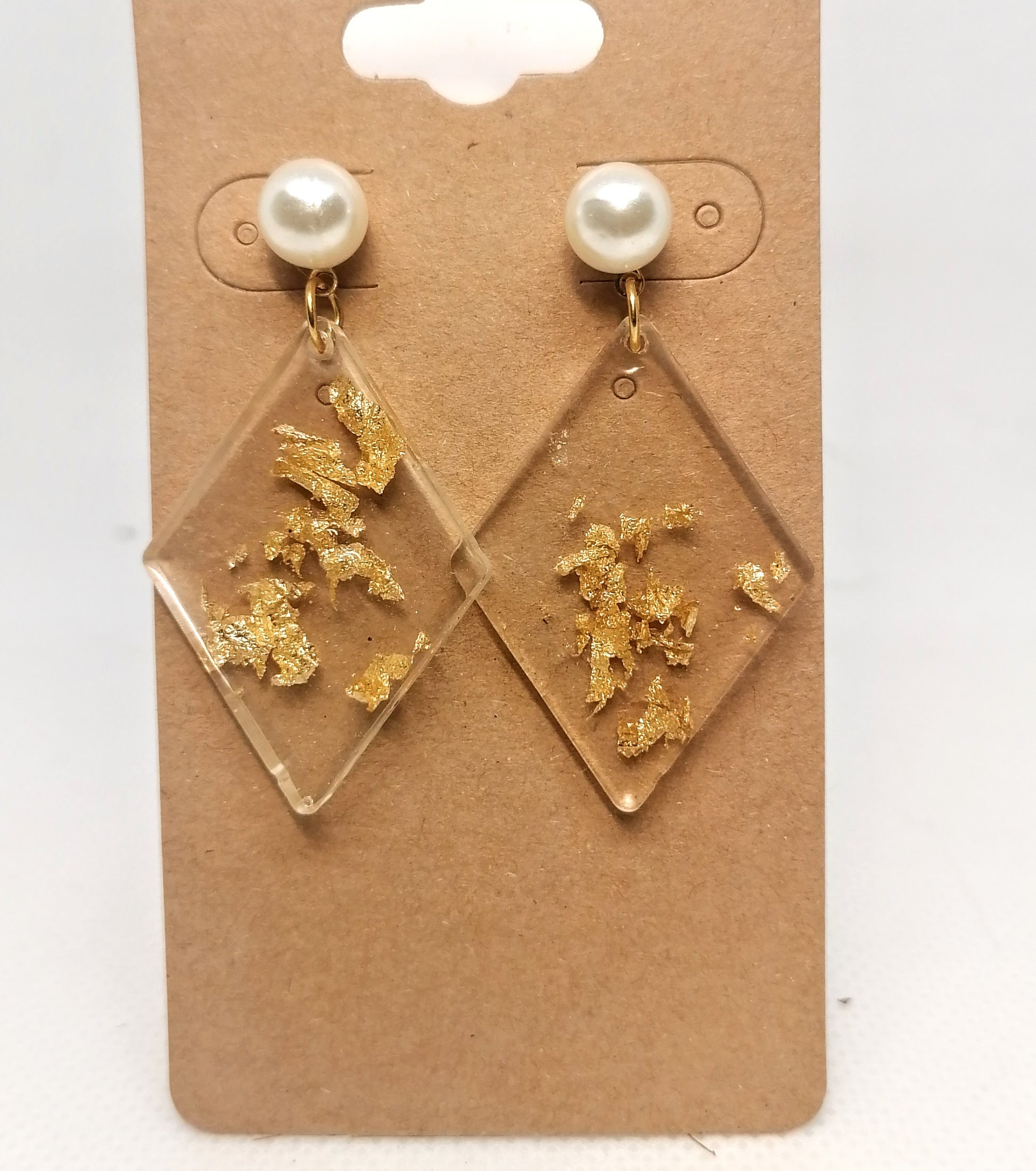 Kullanvärinen nappikorvakoru helmellä. Riipus on glorexin kidehartsia, joka on kirkasta. Seassa lehtikultaa kullan värissä. Tuotteella on ilmainen toimitus.