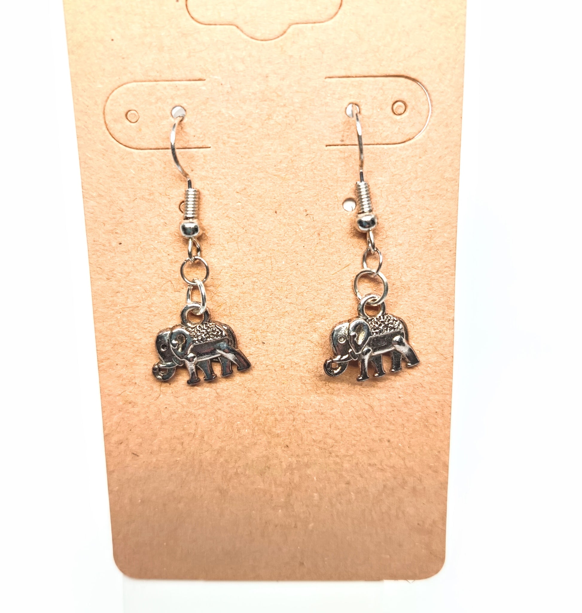 Hopeanvärinen rauta koukkukorvakoru. Riipuksena on hopeanvärinen norsu. tuotteella on ilmainen toimitus.