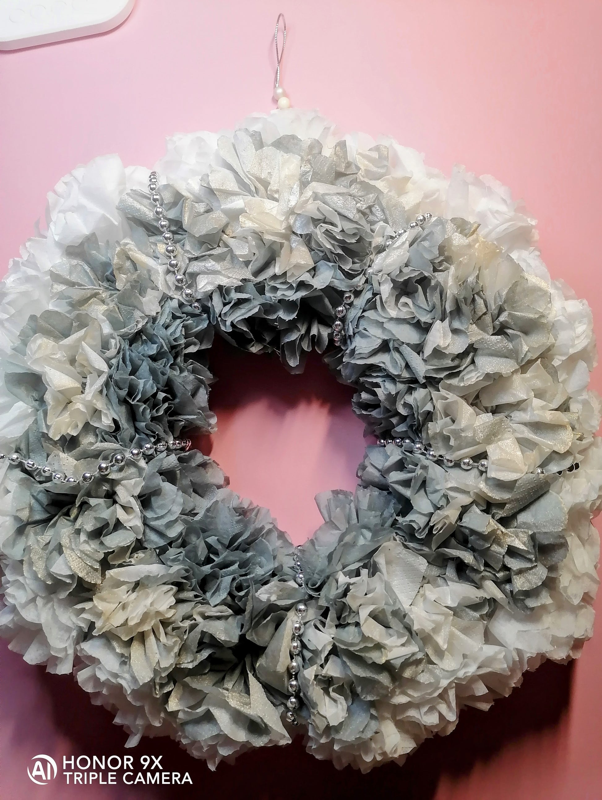 Harmaa-valkoinen servettikranssi 30 cm, Harmaa-valkoisen osuuden päälle suihkutettu hopea sekä kulta suihketta. Koristeeksi laitettu hopeaa helminauhaa. Tuotteella ilmainen toimitus.